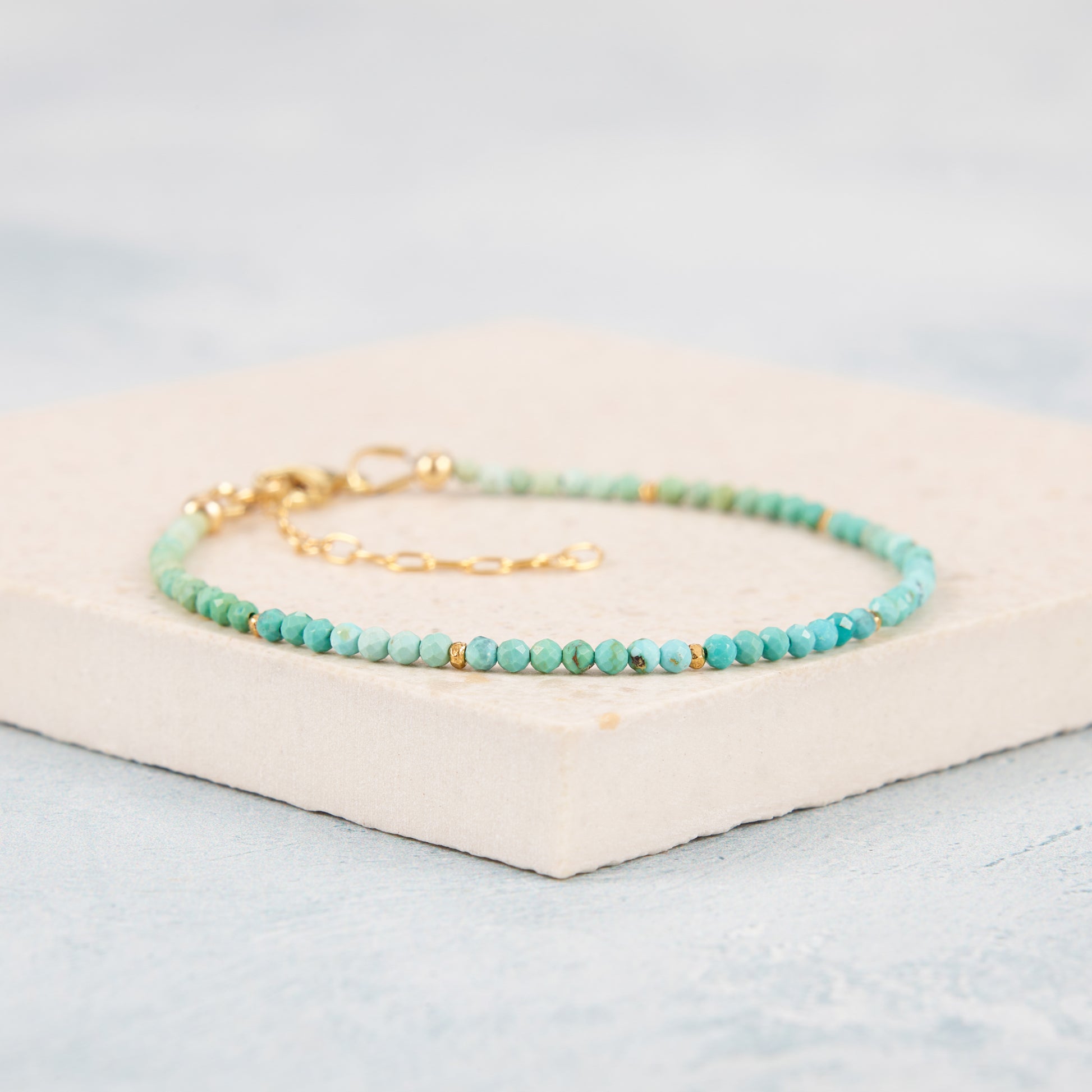 Tiny genuine Sleeping Beauty Turquoise gemstones are arranged in ombre style from blue - green shades in this slender and elegant little bracelet. The stones are micro faceted for lovely light-catching twinkle as the bracelet moves, and are interspersed with your choice of Gold Vermeil or Sterling Silver tiny beads.