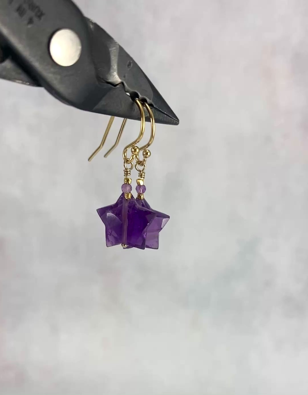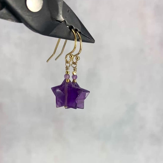 Royal purple Amethyst star gemstones, accented by a tiny Amethyst bead are suspended from your choice of 14k Gold Fill or 925 Sterling Silver ear wires in this very pretty pair of earrings.