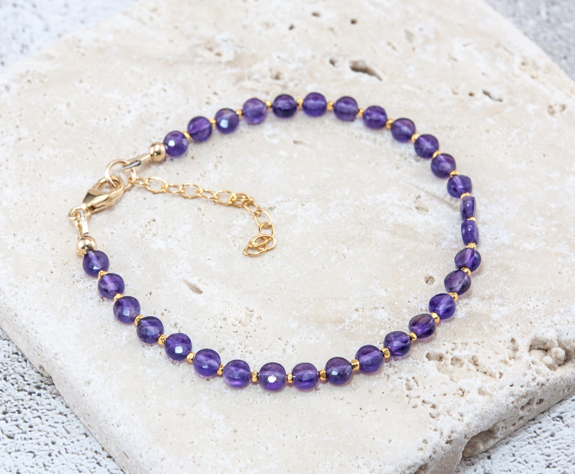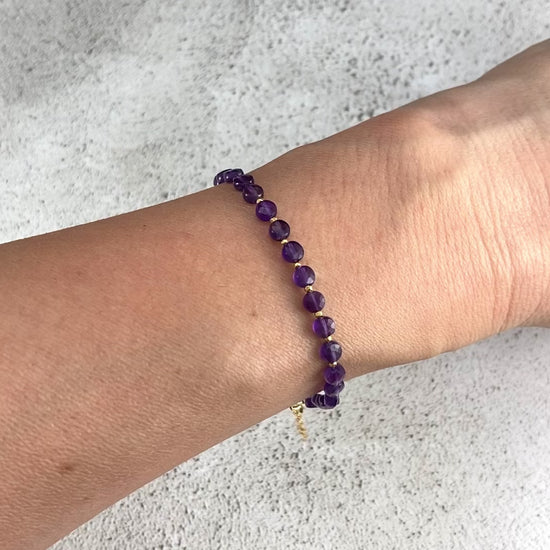 Amethyst gemstone beads in a sweet little coin-shaped cut are interspersed with your choice of tiny Sterling Silver or Gold Vermeil beads in this delicate and dainty bracelet. These gemstones are of excellent quality, Grade AAA, with great clarity, micro faceting for ultimate sparkle, and a rich purple colour.