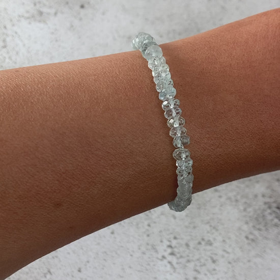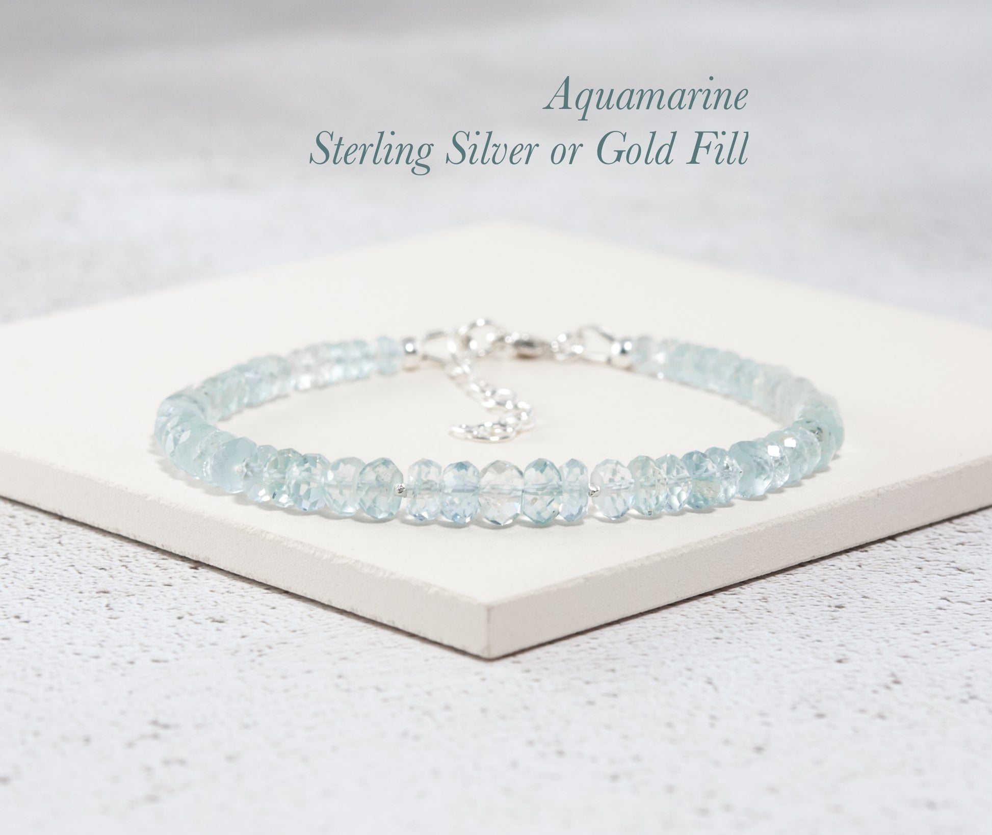 Beautiful pale ice-blue high grade Aquamarine gemstone beads are teamed with solid Sterling Silver or Gold Filled components in this classic and elegant handmade bracelet.
