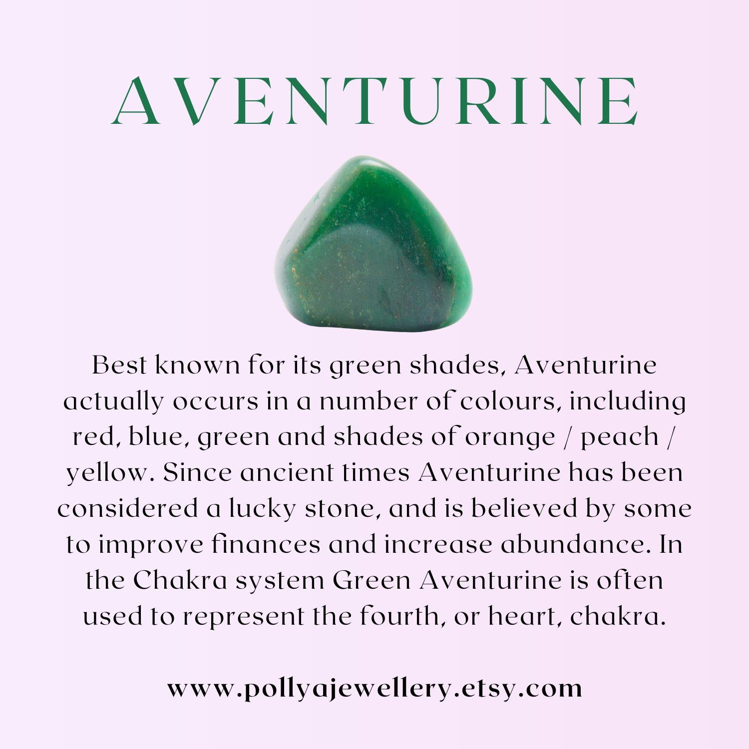 Best known for its green shades, Aventurine actually occurs in a number of colours, including red, blue, green and shades of orange / peach / yellow. Since ancient times Aventurine has been considered a lucky stone, and is believed by some to improve finances and increase abundance. In the Chakra system Green Aventurine is often used to represent the fourth, or heart, chakra.