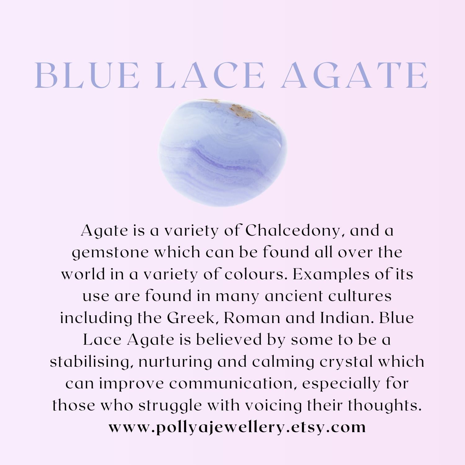 Agate is a variety of Chalcedony, and a gemstone which can be found all over the world in a variety of colours. Examples of its use are found in many ancient cultures including the Greek, Roman and Indian. Blue Lace Agate is believed by some to be a stabilising, nurturing and calming crystal which can improve communication, especially for those who struggle with voicing their thoughts. Blue Lace Agate is typically associated with the Throat Chakra.
