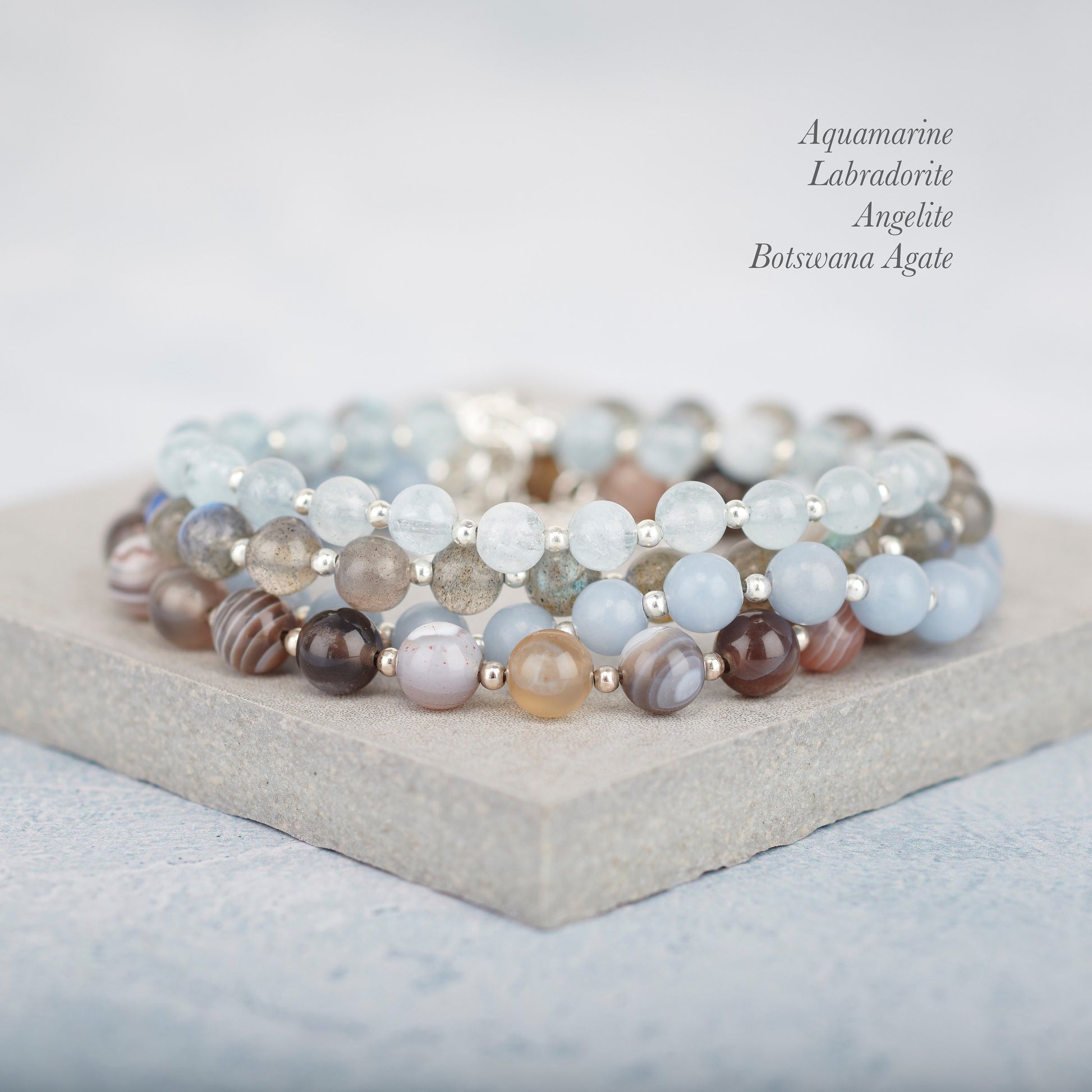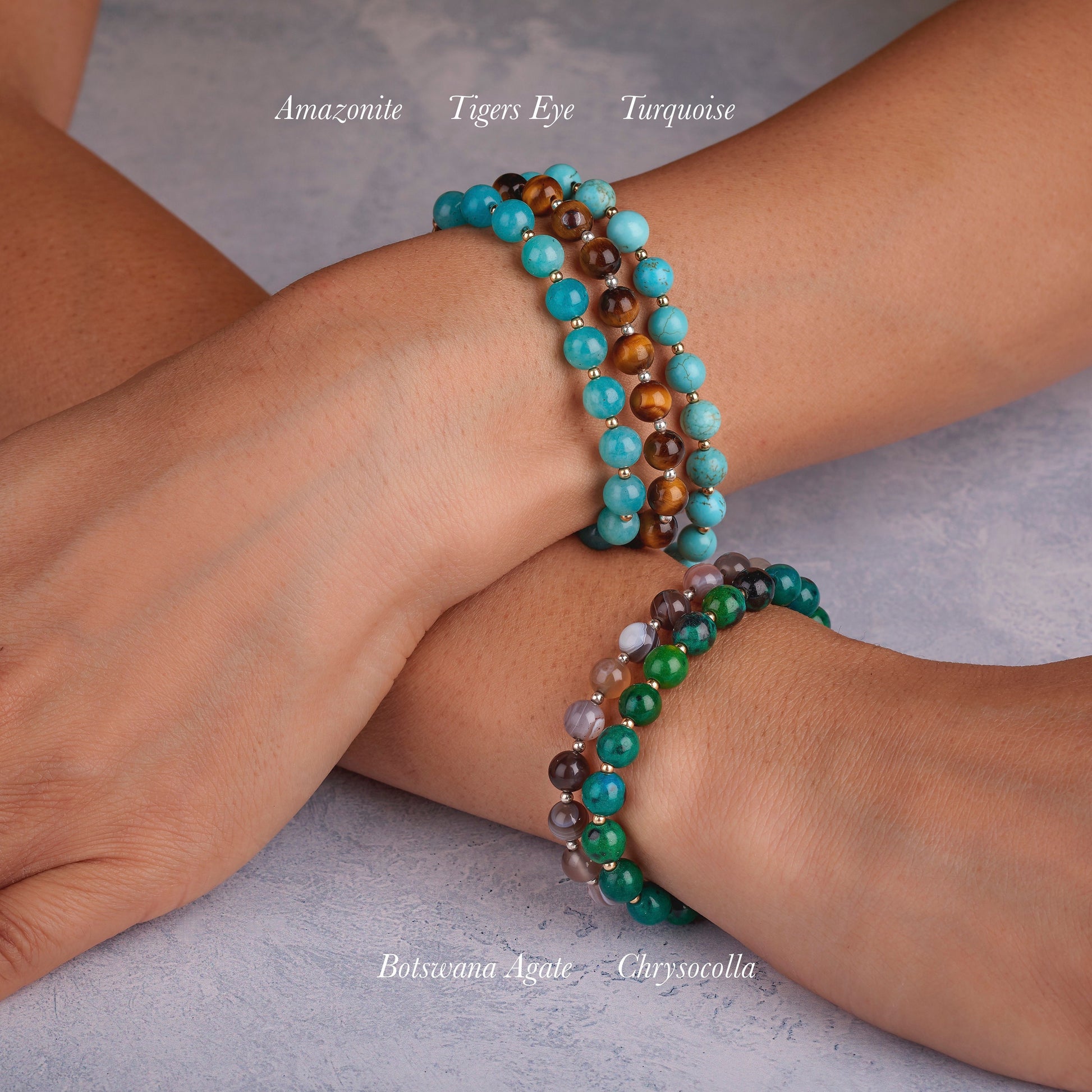 Beautiful Botswana Agate 6mm gemstone beads abound with understated earthy beauty. The swirling banding for which Agate is so loved is displayed in gentle, calming subtle hues of greys, browns and beiges. Smooth, glossy and cool to the touch, the Botswana Agate beads are interspersed with tiny Sterling Silver or Gold Filled beads to make a simple but elegant bracelet.
