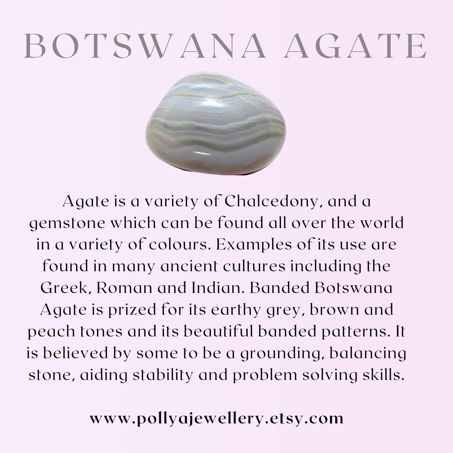 Agate is a variety of Chalcedony, and a gemstone which can be found all over the world in a variety of colours such as white, grey or orange. Examples of its use are found in many ancient cultures including the Greek, Roman and Indian. Botswana Agate is believed by some to have calming, soothing properties and to assist with life's transitions and changes, and is popular as an aid to meditation.