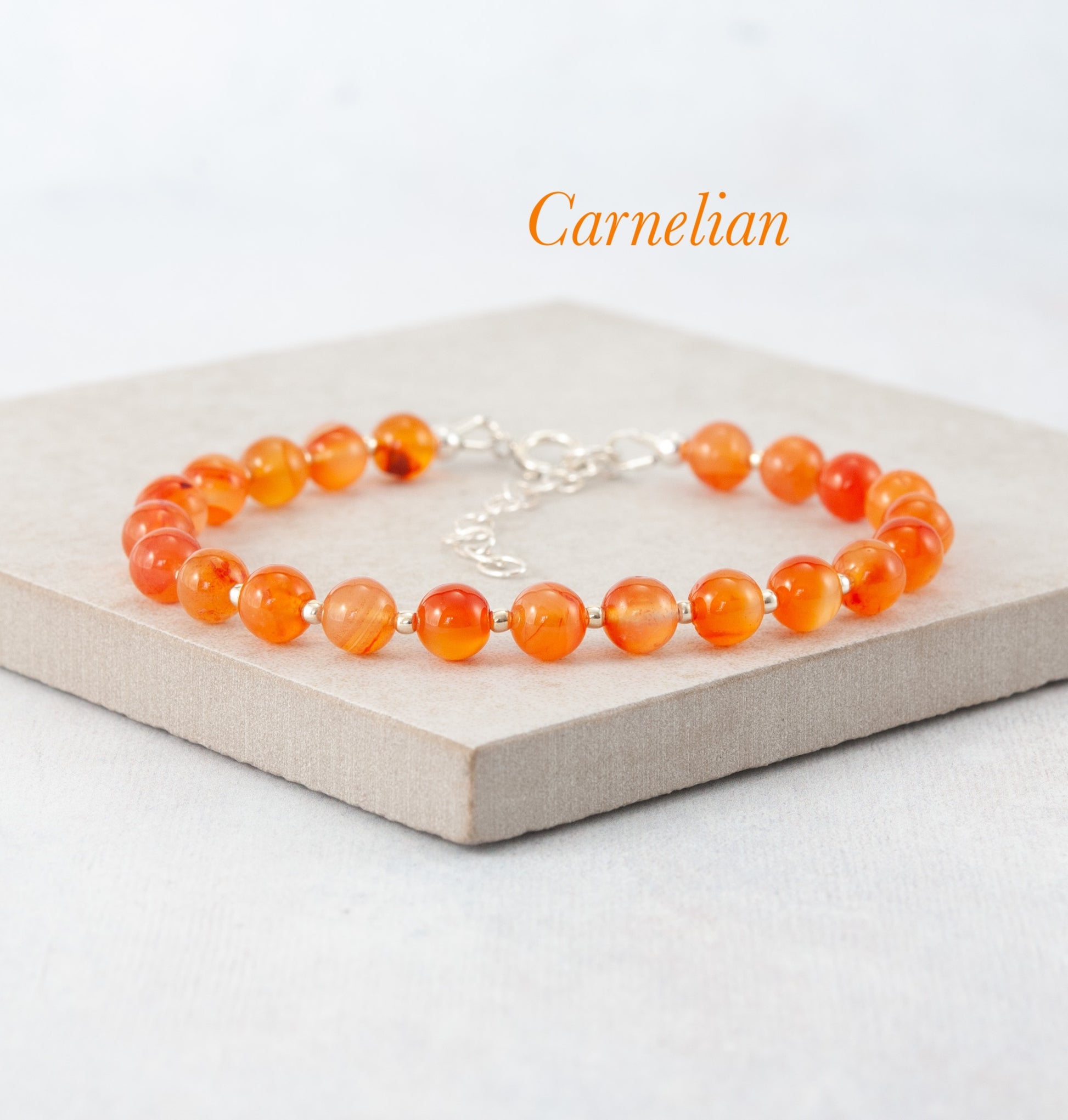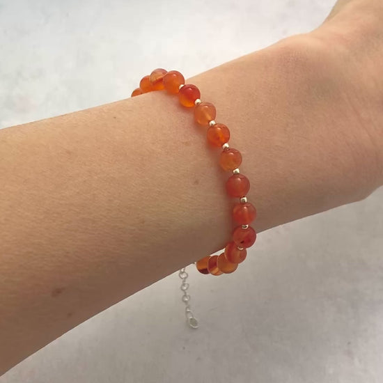 Beautiful warm orange Carnelian gemstone beads glow in this simple yet striking bracelet. The Carnelian beads have a lovely translucent quality and are interspersed with your choice of tiny 14k Gold Fill or 925 Sterling Silver beads.