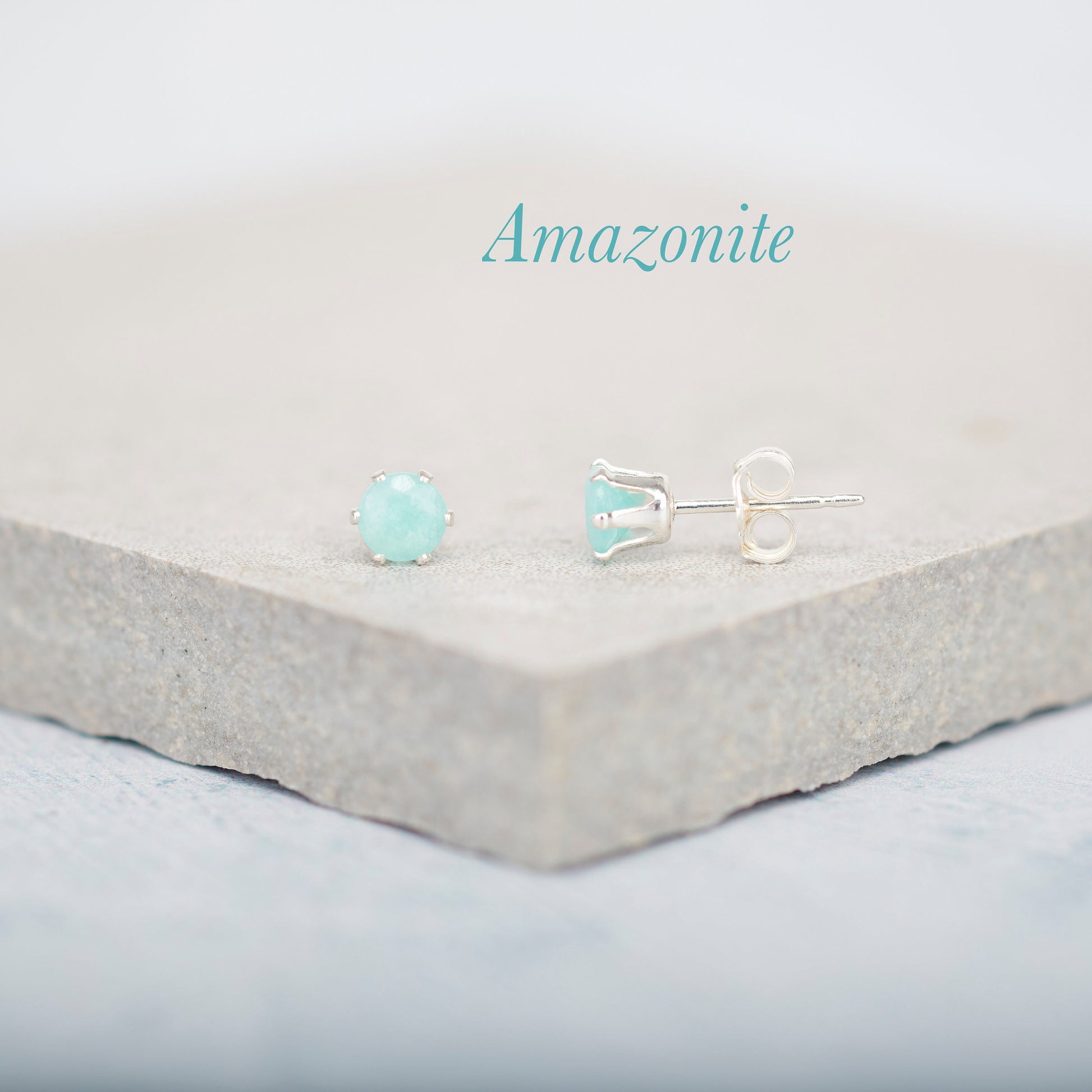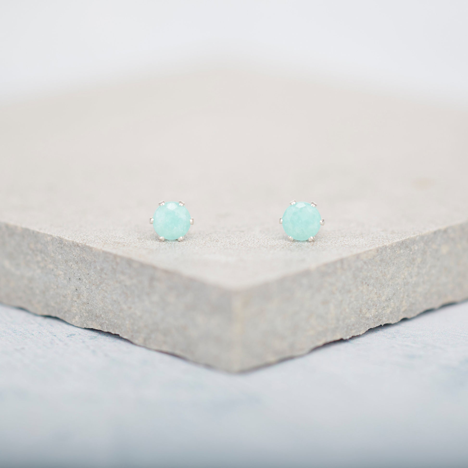 A very dainty pair of stud earrings featuring lovely mint green Amazonite gemstones, faceted for maximum sparkle.