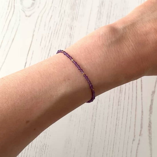 Rich purple Amethyst beads are faceted for maximum sparkle in this slender and elegant gemstone bracelet. The Amethyst stones are of exceptionally high quality, Grade AAA, and are interspersed with tiny faceted beads in your choice of Gold Vermeil or 925 Sterling Silver.