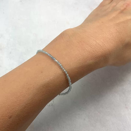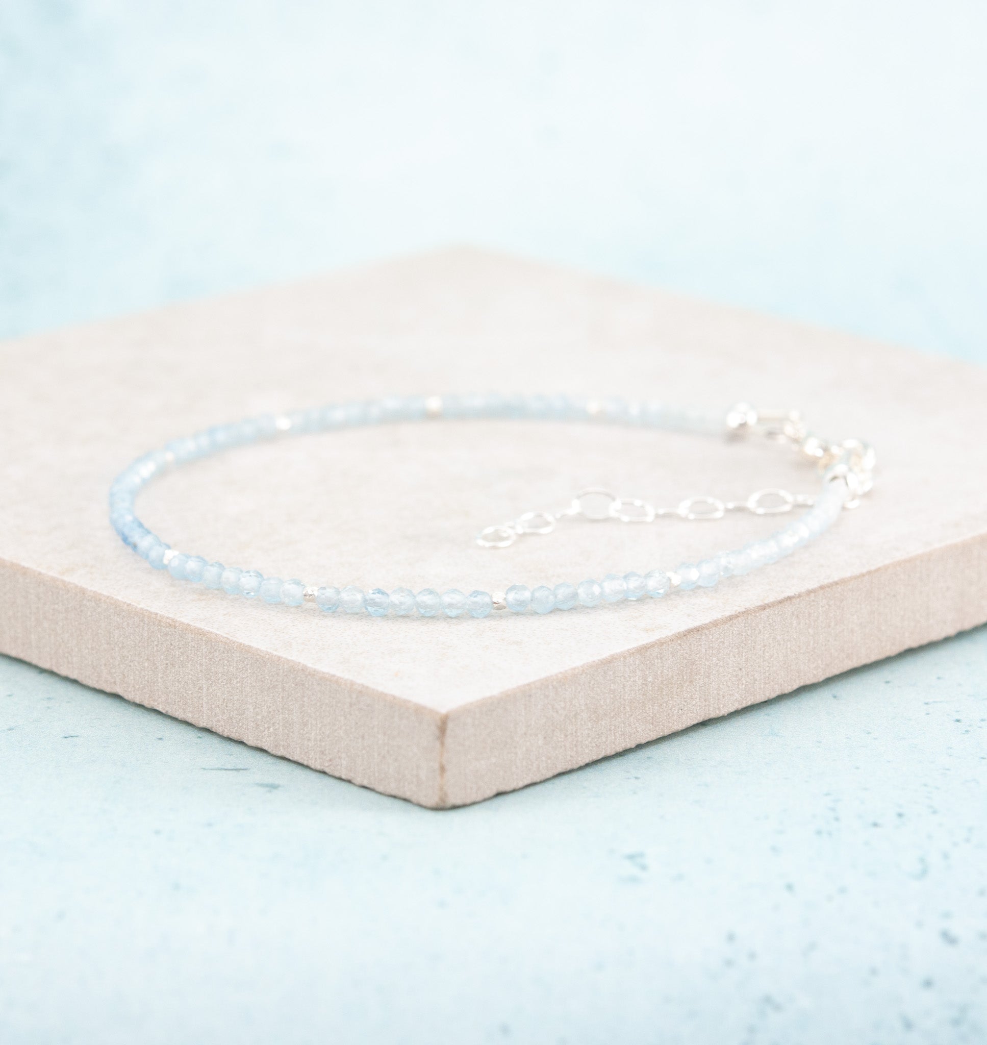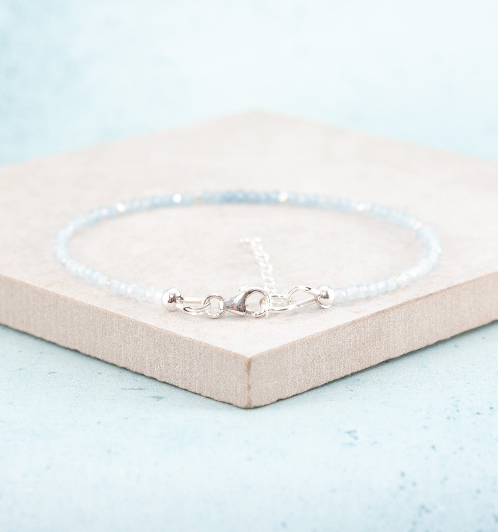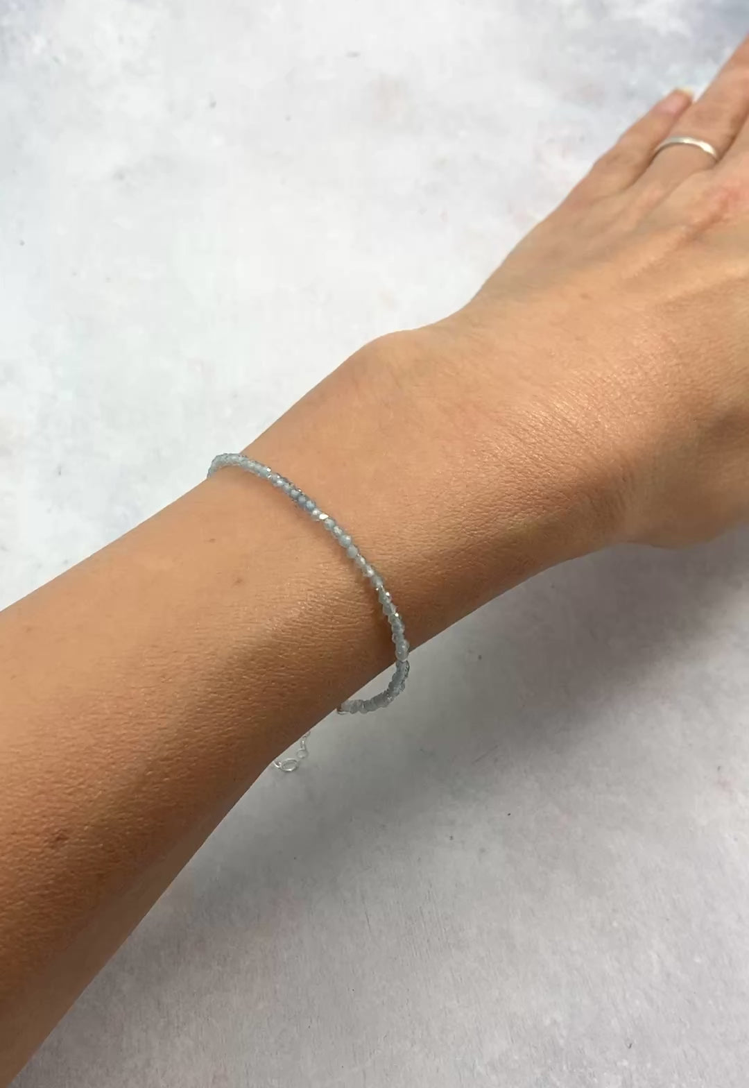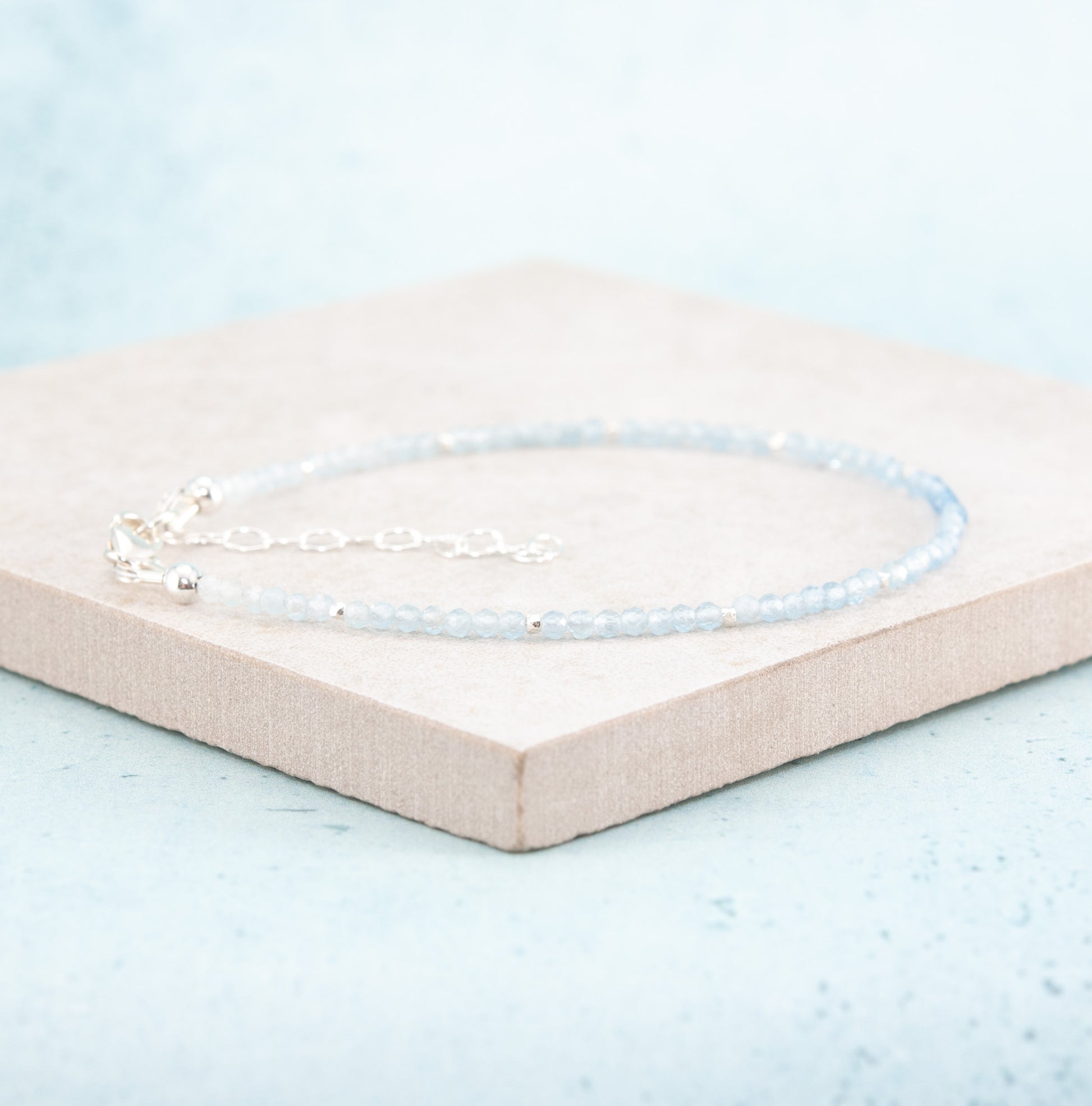 A super dainty little bracelet featuring tiny Aquamarine gemstones, arranged in ombre style and interspersed with your choice of Sterling Silver or Gold Vermeil beads. The Aquamarine stones are of excellent AAA grade quality, and are micro faceted for maximum sparkle. They have excellent clarity with a beautiful soft blue colour.