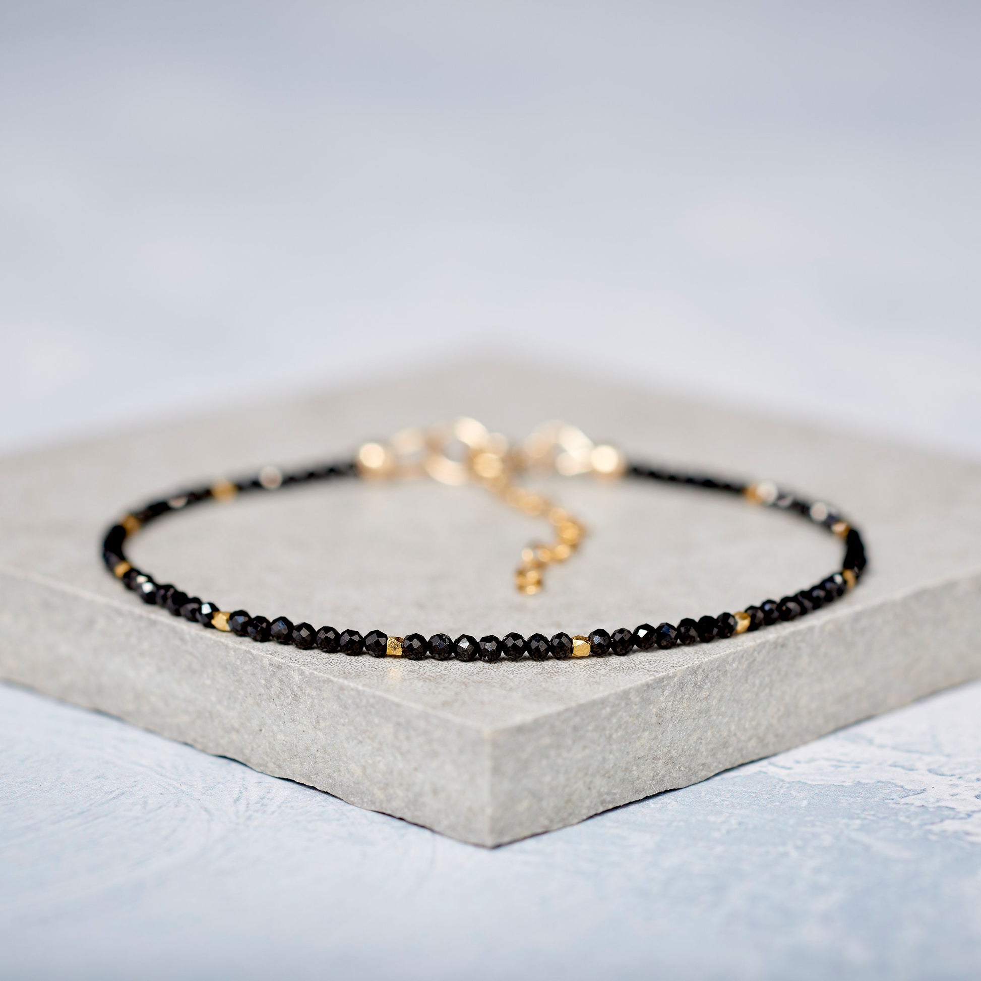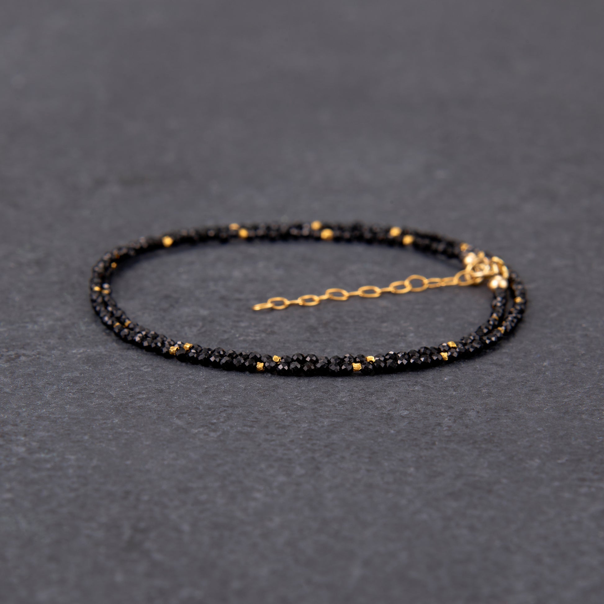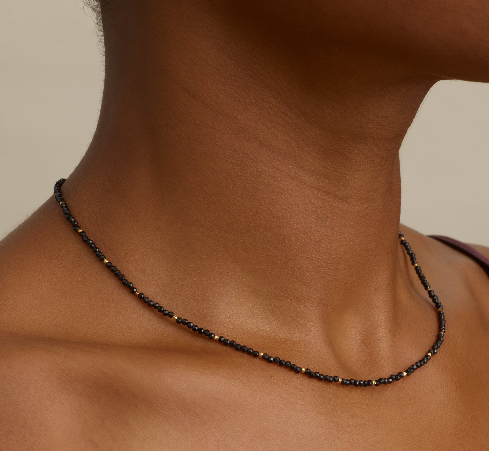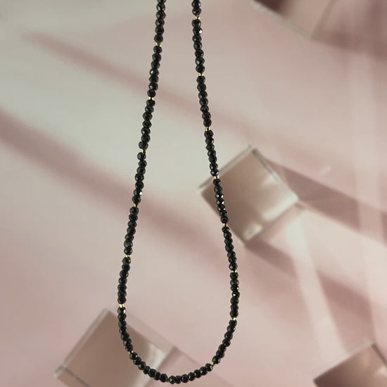 Tiny Black Spinel gemstone beads are micro faceted to deliver incredible sparkle in this slender, minimalist and elegant necklace. Beautifully glossy, the Black Spinel beads are interspersed with your choice of even tinier Gold Vermeil or 925 Sterling Silver beads.