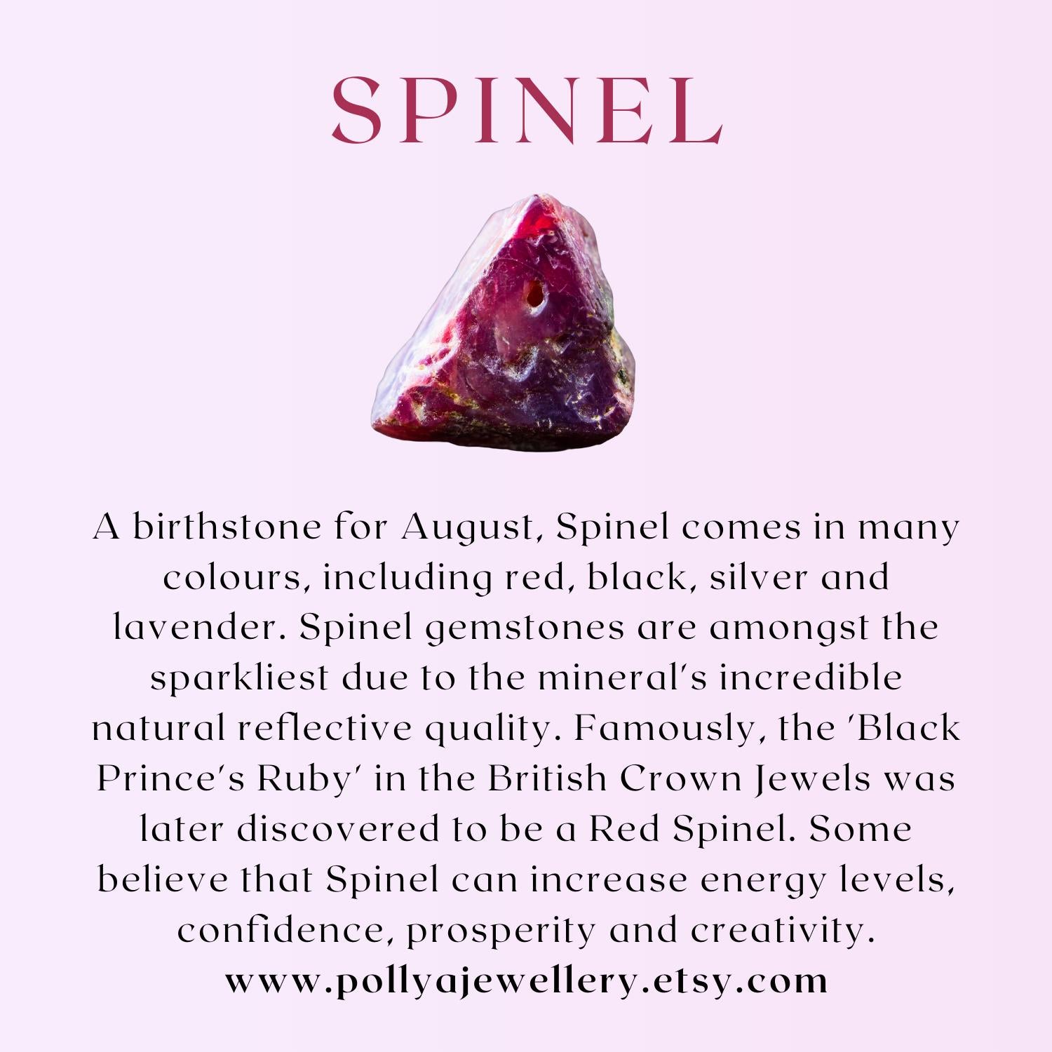 Spinel comes in many colours, including red, black, silver and lavender. Spinel gemstones are amongst the sparkliest due to the mineral's incredible natural reflective quality. Famously, the 'Black Prince's Ruby' in the British Crown Jewels was later discovered to be a Red Spinel. Some believe that Spinel can increase energy levels, confidence, prosperity and creativity. Spinel is a birthstone for the month of August.