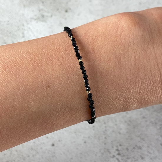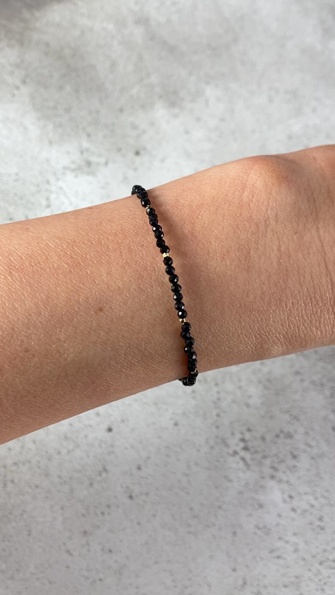 A super dainty little bracelet featuring genuine natural Black Tourmaline gemstone beads, interspersed with your choice of either Sterling Silver or Gold Vermeil beads. The Tourmaline beads have beautiful faceting for maximum sparkle, and are a lovely glossy black.
