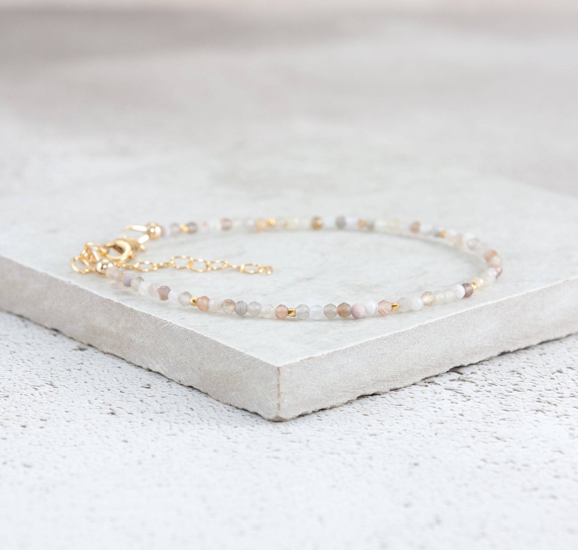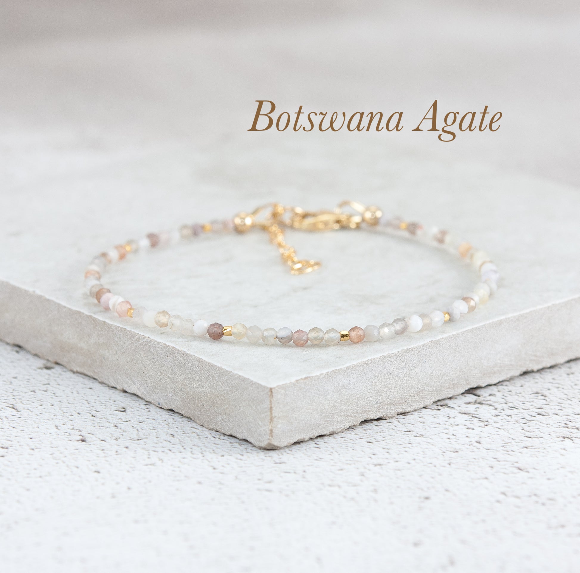 A very delicate, slender and elegant gemstone bracelet featuring natural Botswana Agate gemstone beads, faceted for brilliant sparkle. These gemstones are of a lovely quality, with a subtle, neutral and earthy colour palette of grey, white, beige and brown. Tiny faceted beads in your choice of Gold Vermeil or 925 Sterling Silver add a luxurious touch to this slim bracelet.
