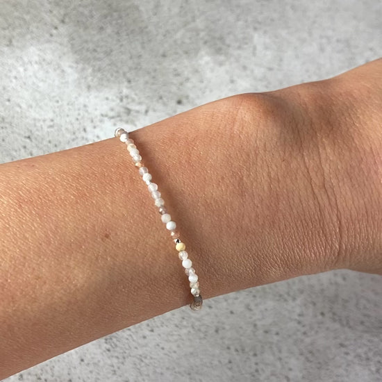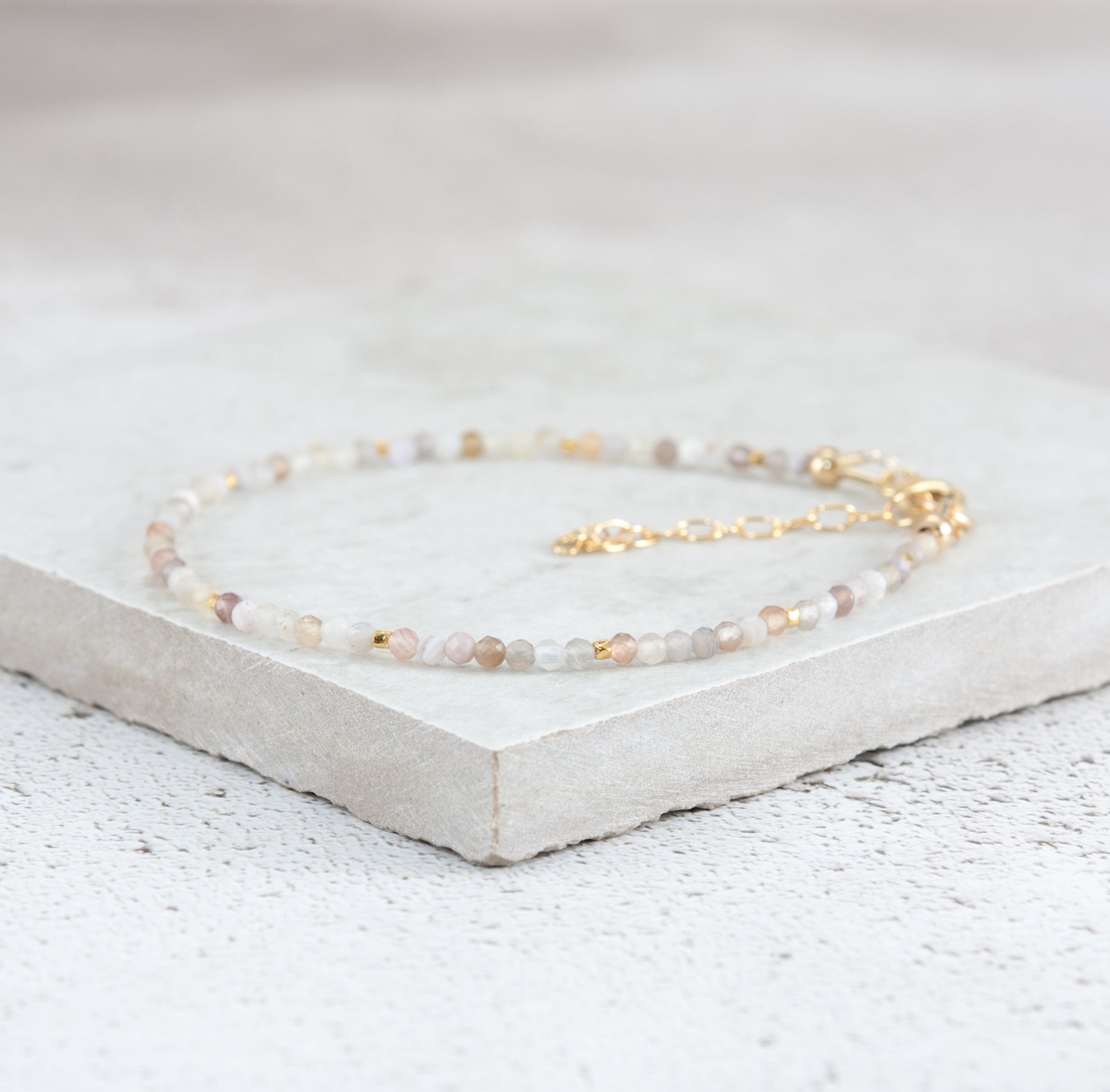 The clasp, findings and extension chain are all solid 925 Sterling Silver or 14k Gold Filled, and the beads are strung on very fine and flexible but strong jewellery wire, making the bracelet dainty in size, but strong and durable.