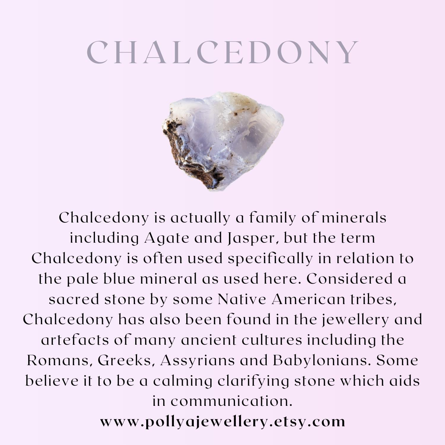 Chalcedony is actually a family of minerals including Agate and Jasper, but the term Chalcedony is often used specifically in relation to the pale blue mineral as used here. Considered a sacred stone by some Native American tribes, Chalcedony has also been found in the jewellery and artefacts of many ancient cultures including the Romans, Greeks, Assyrians and Babylonians. Some believe it to be a calming clarifying stone which aids in communication.