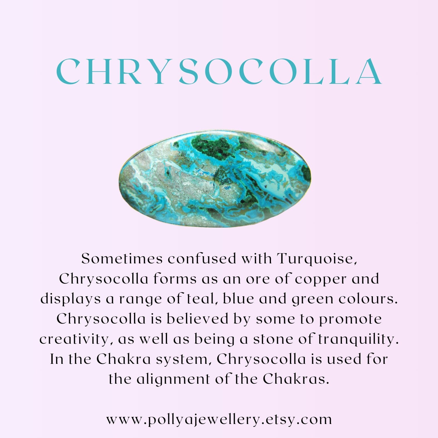 Sometimes confused with Turquoise, Chrysocolla forms as an ore of copper and displays a range of teal, blue and green colours. Chrysocolla is believed by some to promote creativity, as well as being a stone of tranquility. In the Chakra system, Chrysocolla is used for the alignment of the Chakras.