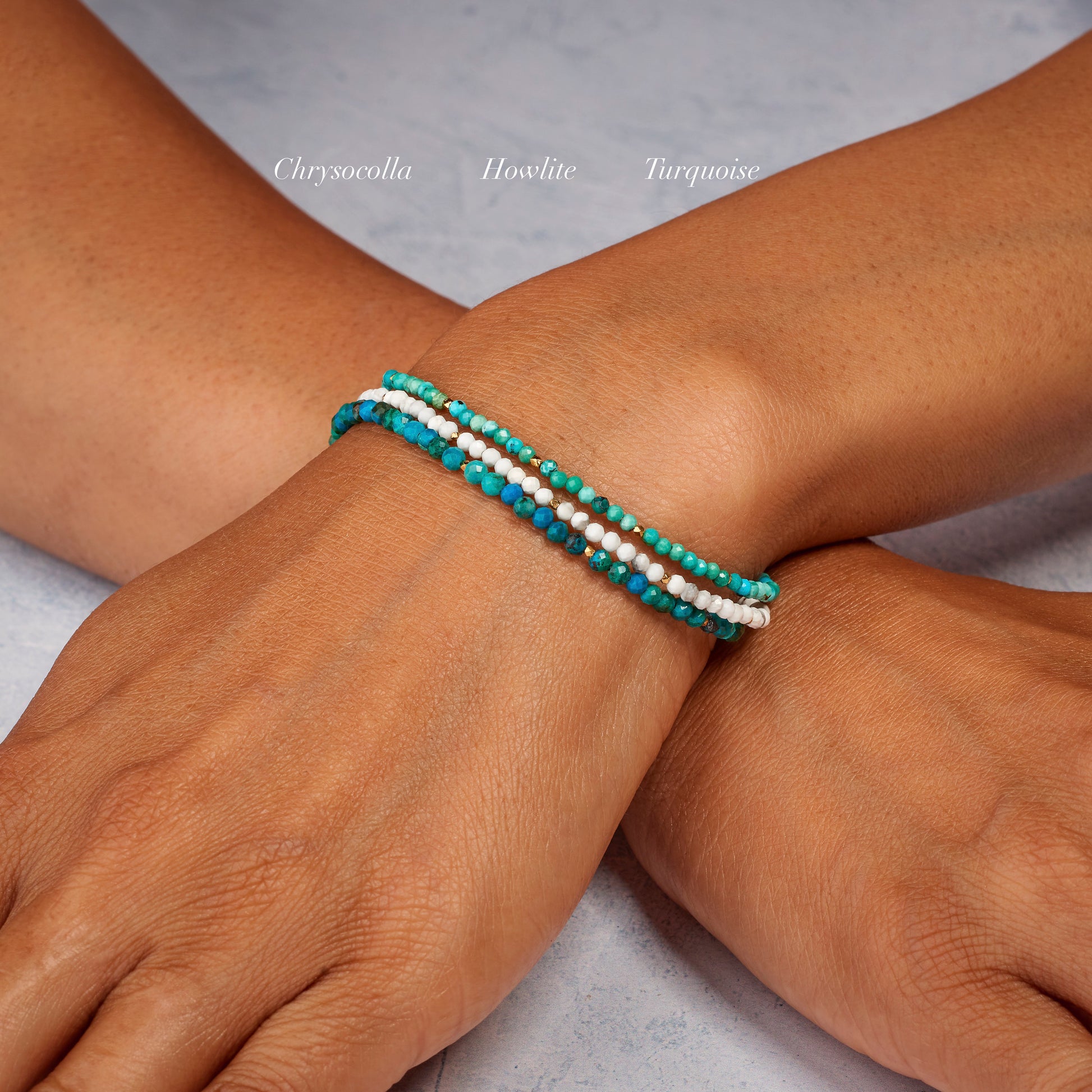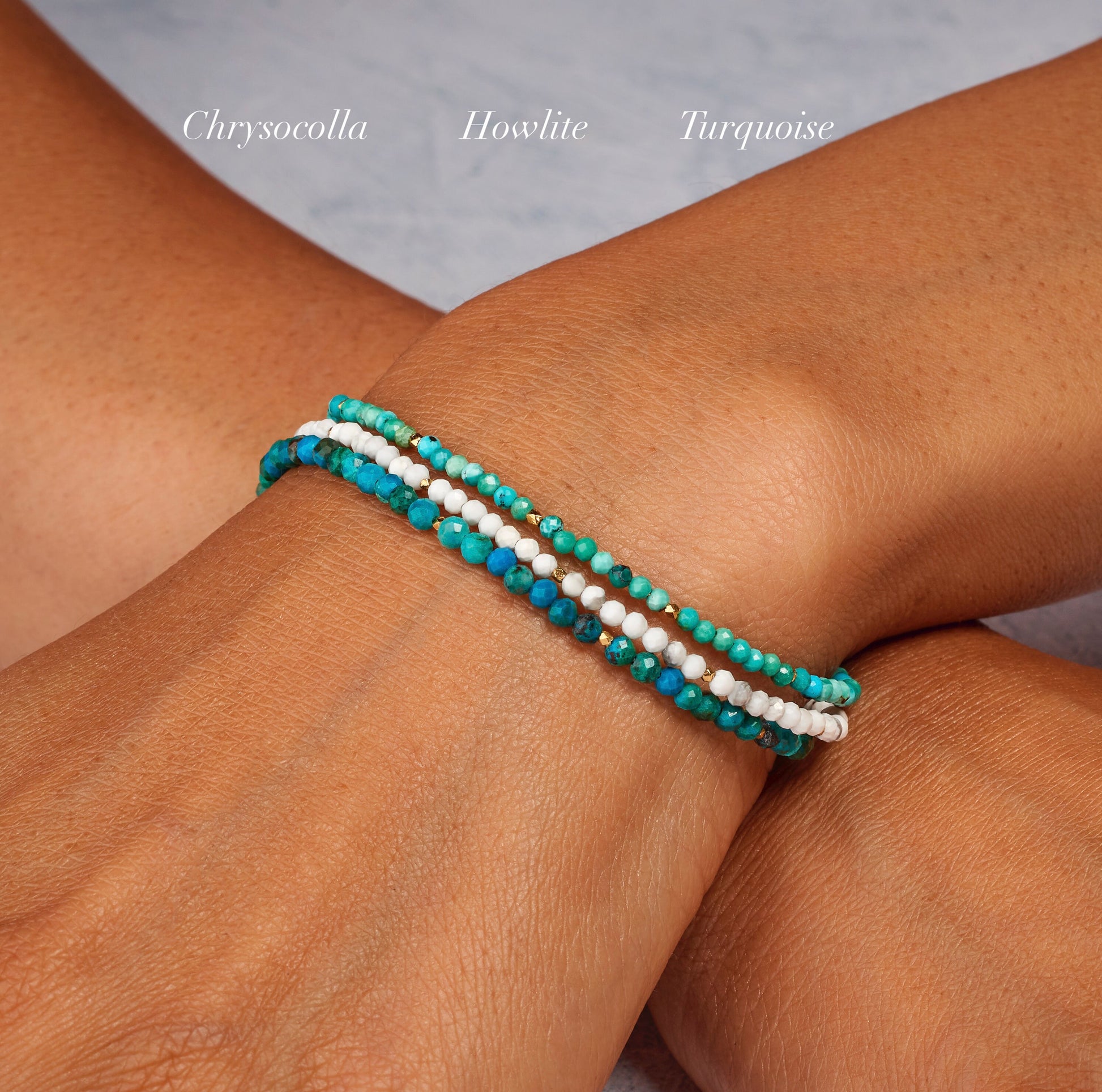 Beautiful Chrysocolla gemstones are micro faceted for maximum sparkle in this pretty little bracelet. These natural gemstone beads show varying shades of teal, turquoise, green and blue and are interspersed with your choice of tiny Gold Vermeil or 925 Sterling Silver beads.