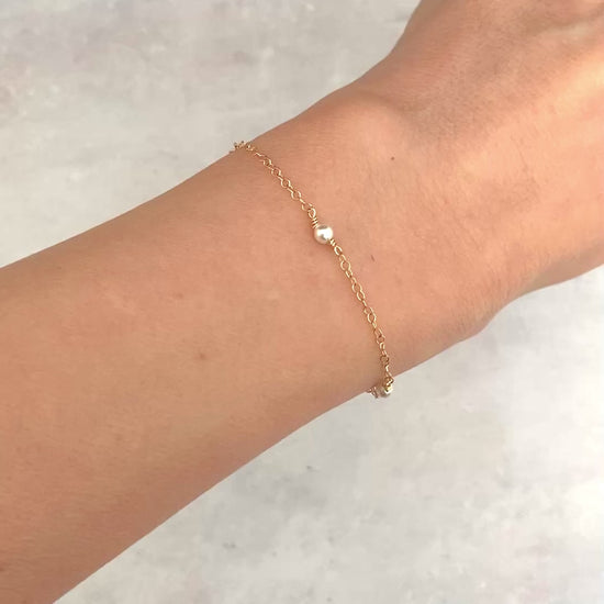 A very delicate, dainty and pretty bracelet made from 14k Gold Fill chain with tiny white crystal pearls stationed at intervals.