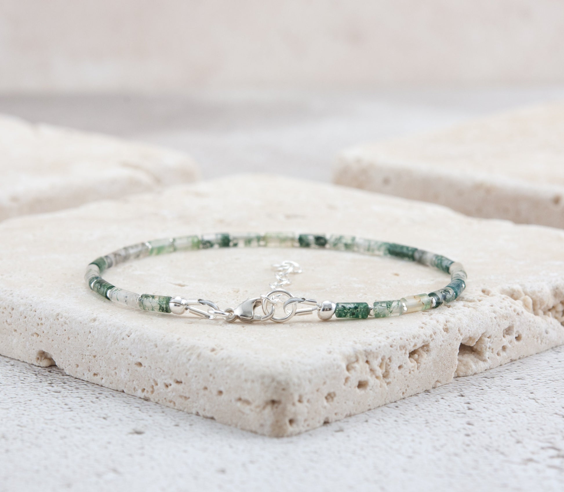 A very dainty gemstone bracelet featuring tiny beautifully smooth Moss Agate beads in a slender and sweet tube shape, interspersed with your choice of Sterling Silver or Gold Vermeil beads.
