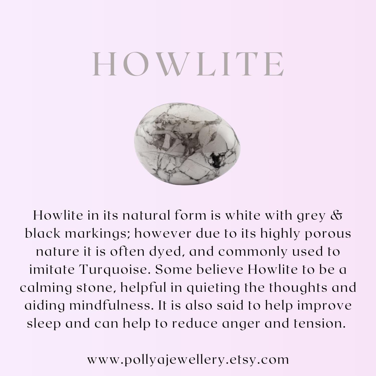 Howlite in its natural form is white with grey & black markings; however due to its highly porous nature it is often dyed, and commonly used to imitate Turquoise. Some believe Howlite to be a calming stone, helpful in quieting the thoughts and aiding mindfulness. It is also said to help improve sleep and can help to reduce anger and tension.