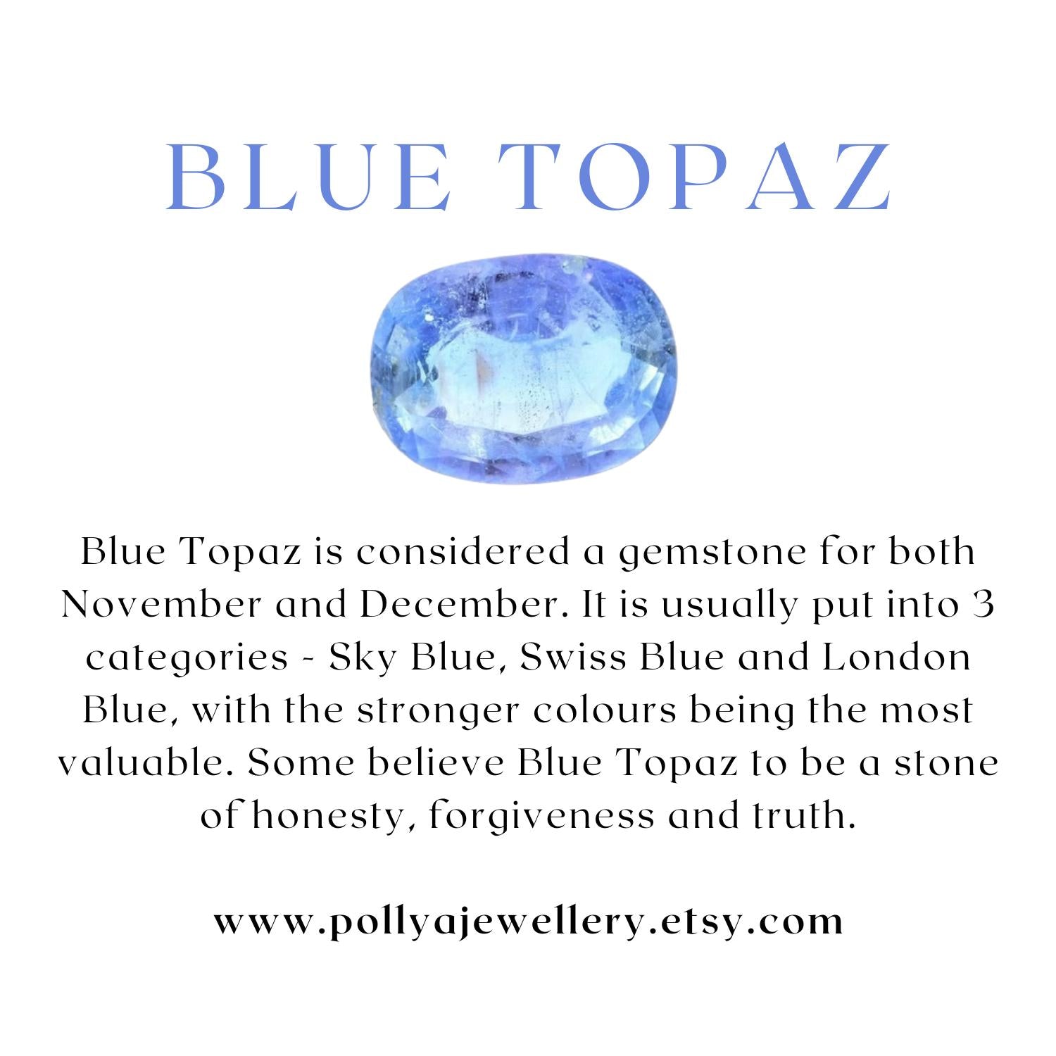 Blue Topaz is considered a gemstone for both November and December. It is usually put into 3 categories - Sky Blue, Swiss Blue and London Blue, with the stronger colours being the most valuable. Some believe Blue Topaz to be a stone of honesty, forgiveness and truth.