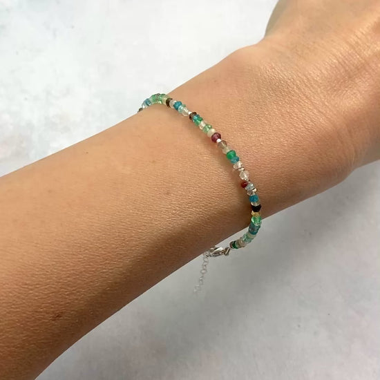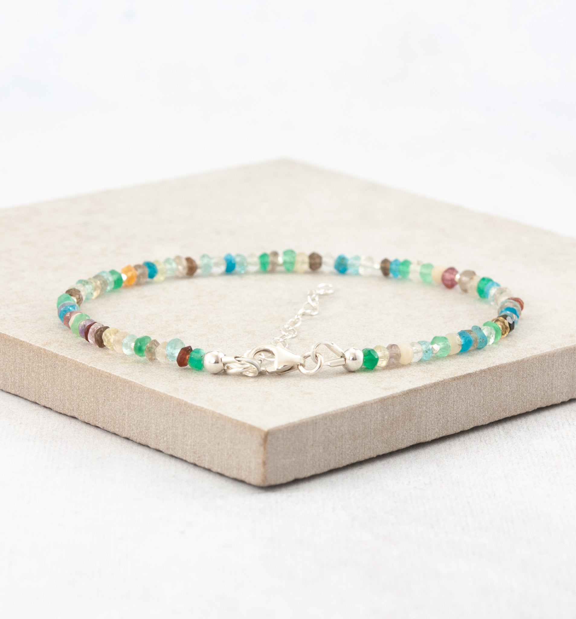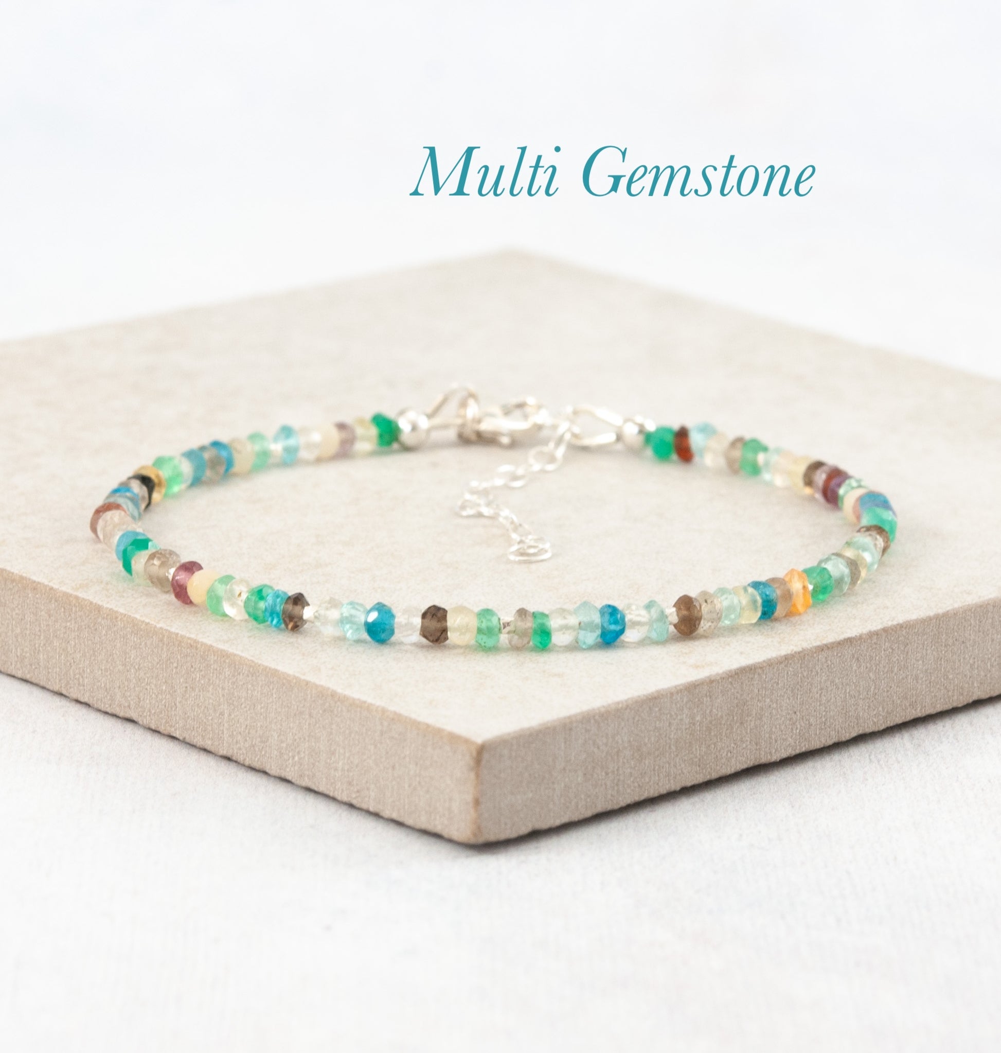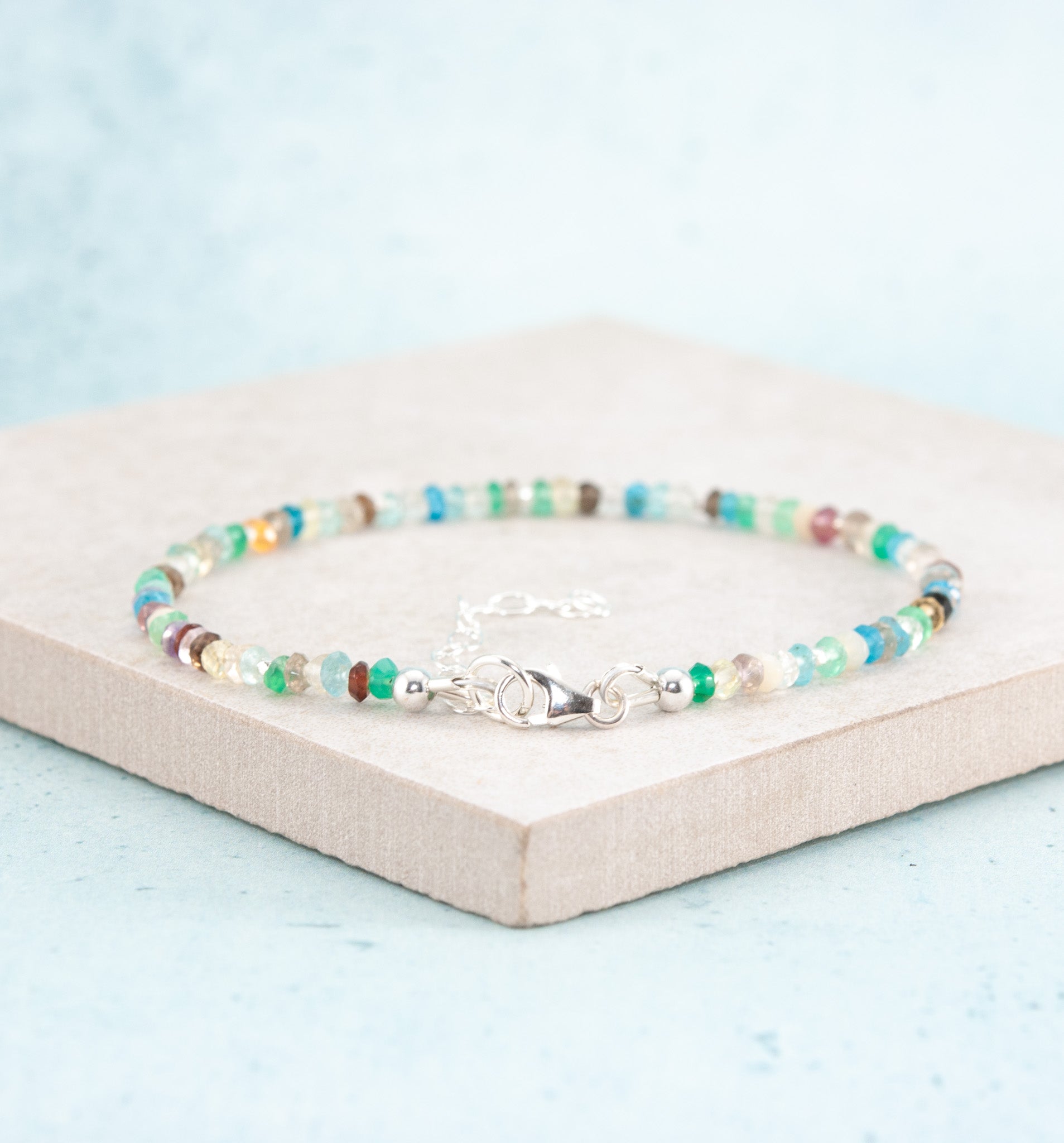 A super dainty little bracelet featuring a beautiful selection of tiny genuine gemstone beads in a slim rondelle cut, interspersed with your choice of either Gold Vermeil or Sterling Silver beads. Pretty, sparkly and sweet, the colours in this bracelet are designed to bring a touch of joy to your wrist. The gemstones include Blue Apatite, Green Onyx, Garnet, Carnelian, Smoky Quartz, Rock Crystal, Amethyst, Citrine and others.