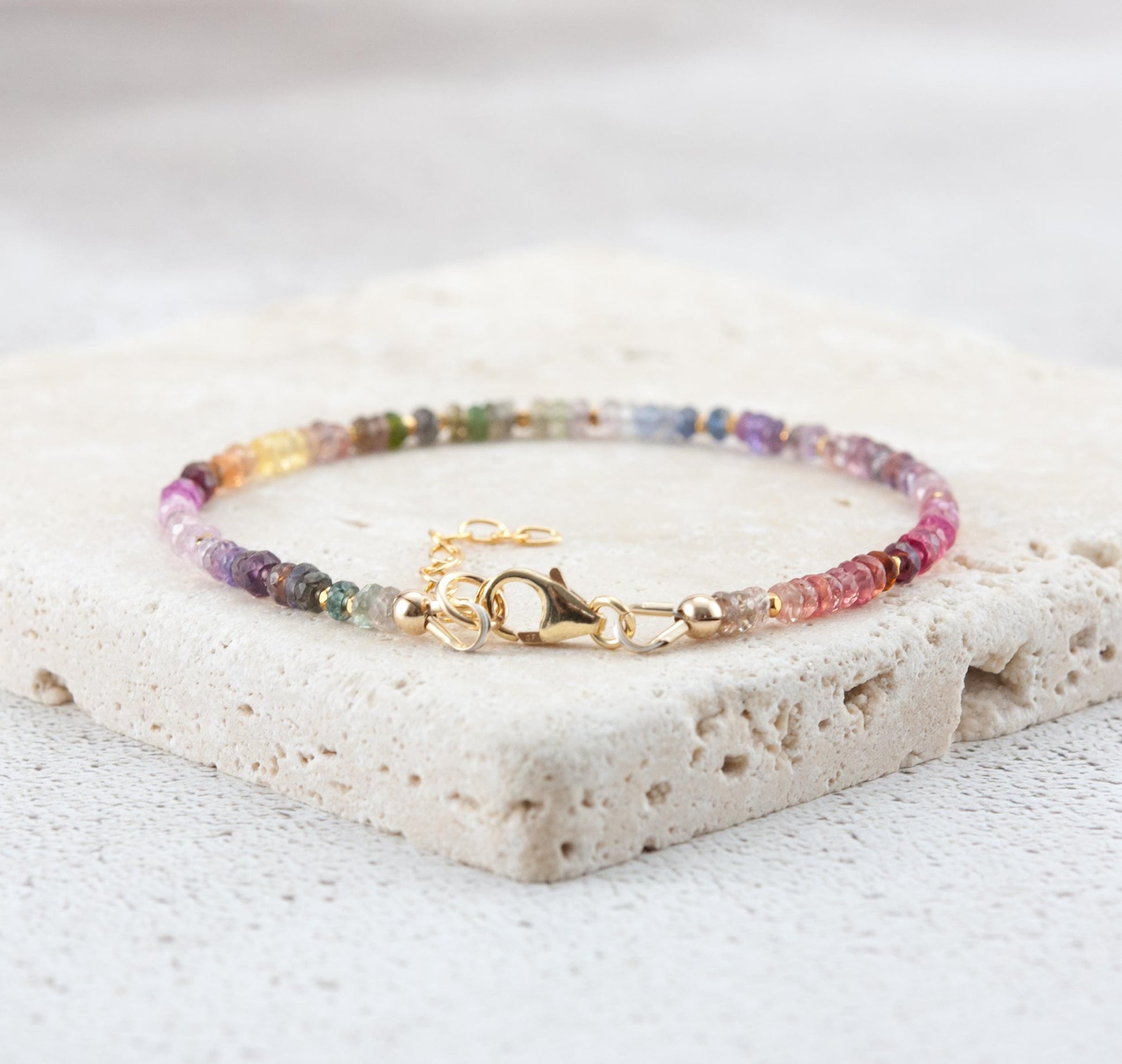 Vibrant and colourful natural Sapphire gemstone beads in a kaleidoscope of colours combine with your choice of Gold Vermeil or 925 Sterling Silver tiny beads in this delicate and elegant bracelet.