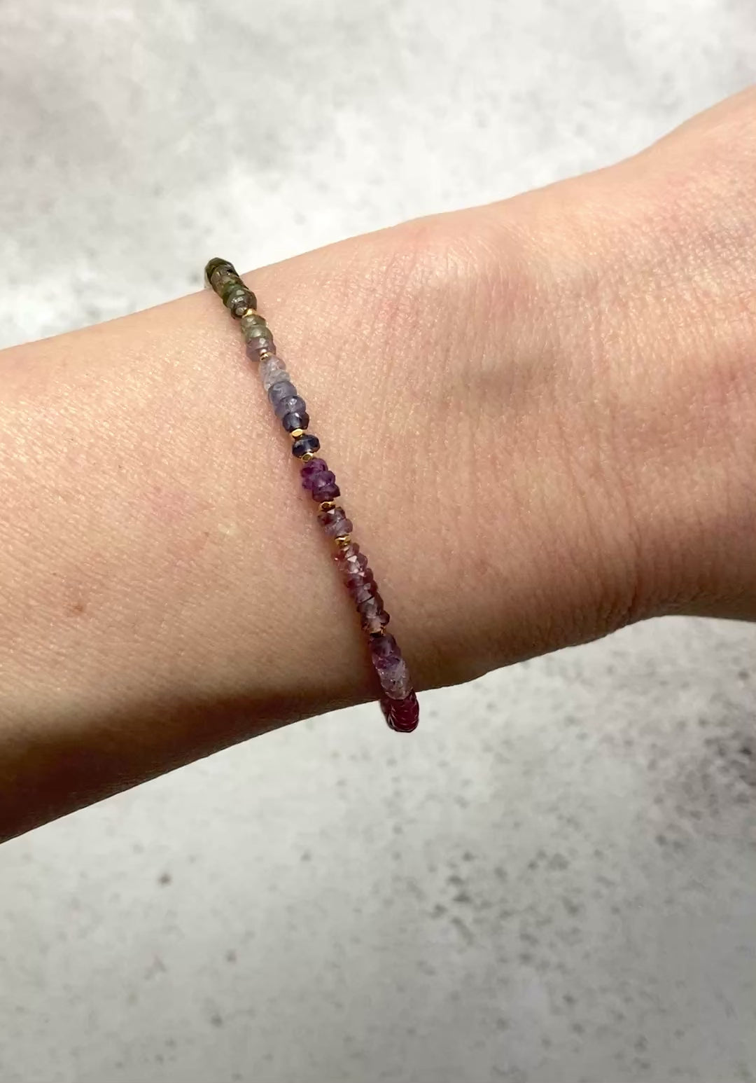 The Sapphire stones are very dainty, just 3mm, and are micro faceted for mesmerising sparkle. The colours range from blues to greens to pinks, purples and yellows, carefully shaded ombre-style from pale to deep shades, ensuring each bracelet is unique.
