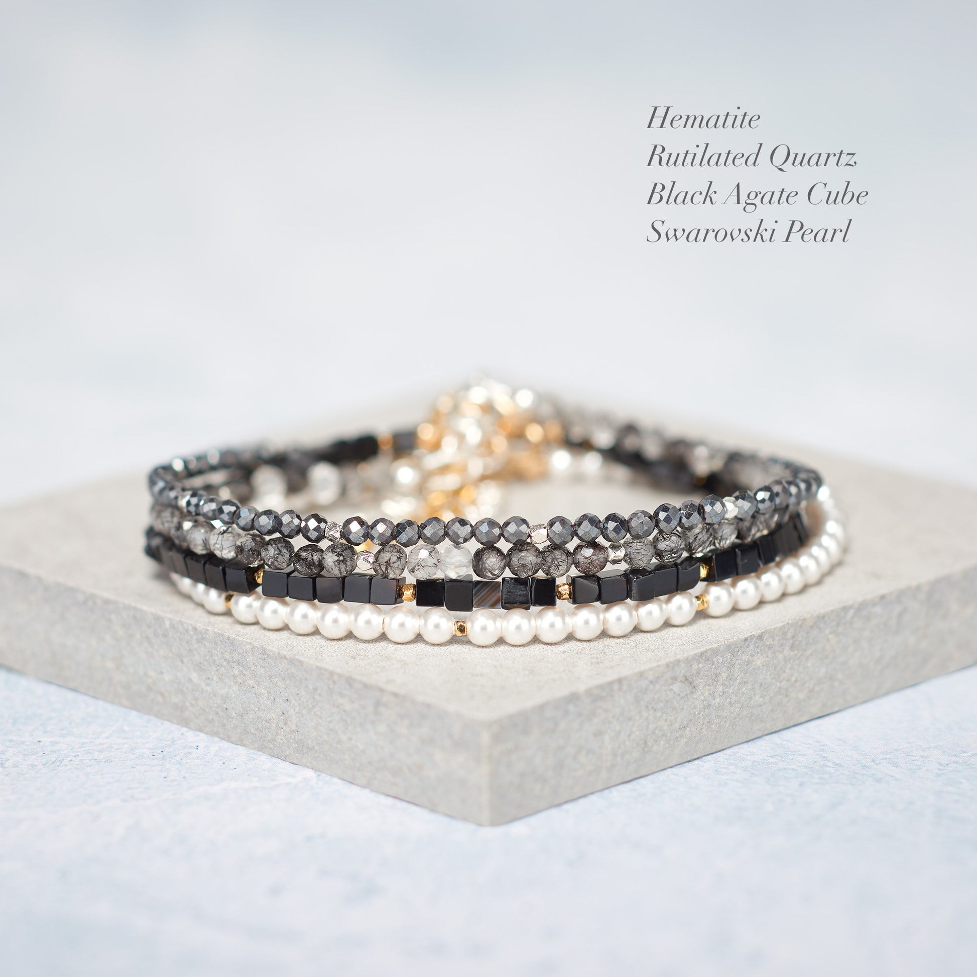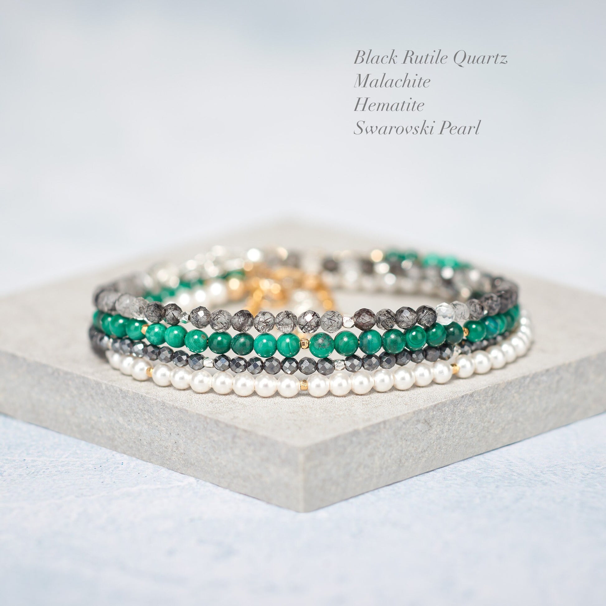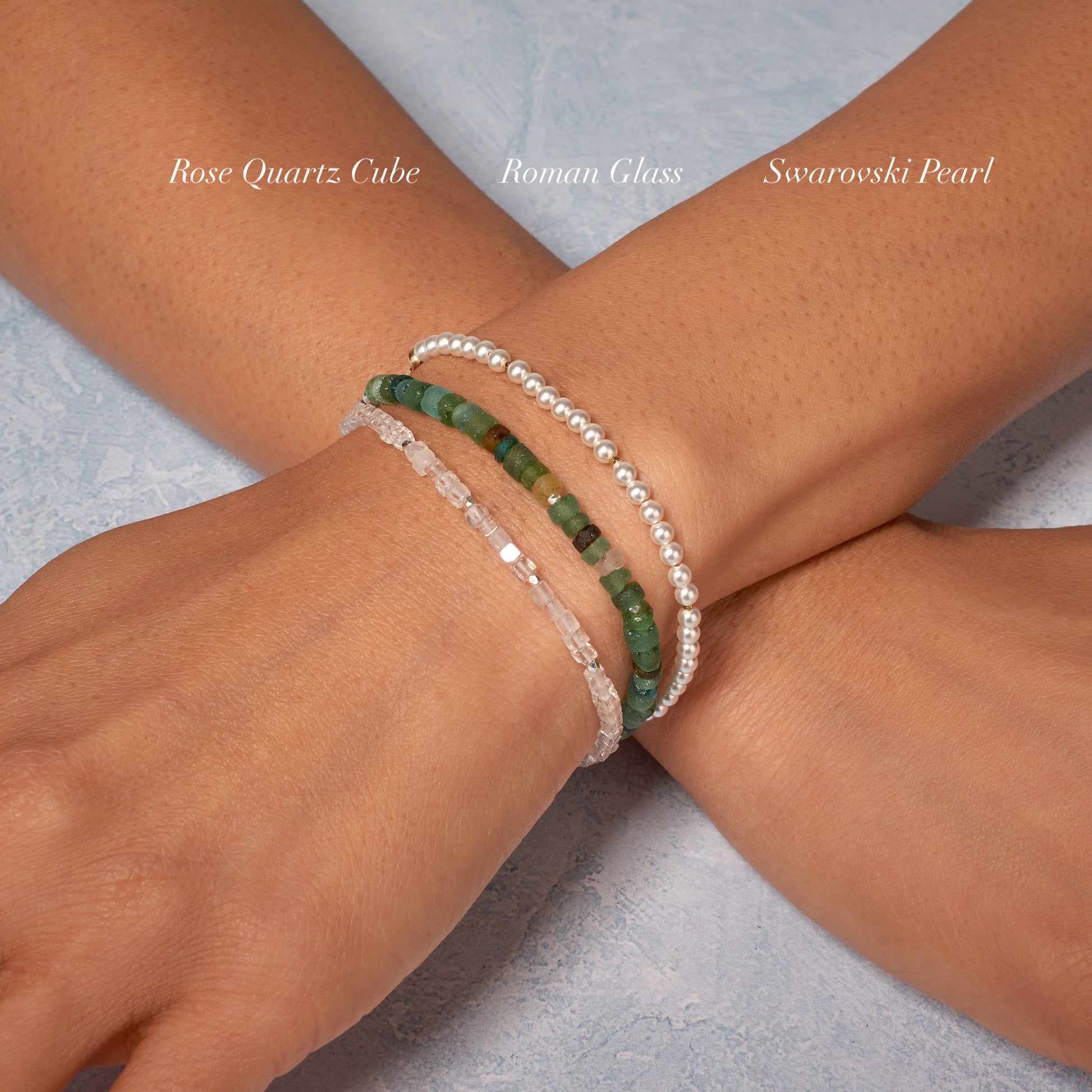 The clasp, findings and extension chain are all solid 925 Sterling Silver or 14k Gold Filled, and the beads are strung on very fine and flexible but strong jewellery wire, making the bracelet dainty in size, but strong and durable.