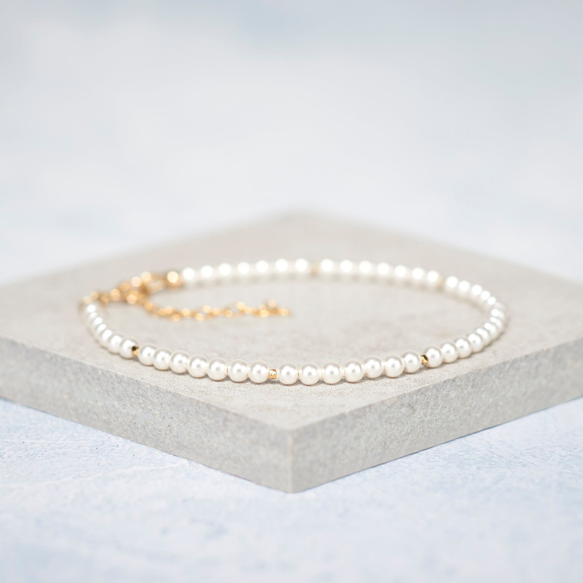 A dainty, delicate and minimalist bracelet made with little 3mm white Crystal Pearls interspersed with your choice of tiny Gold Vermeil or 925 Sterling Silver beads.