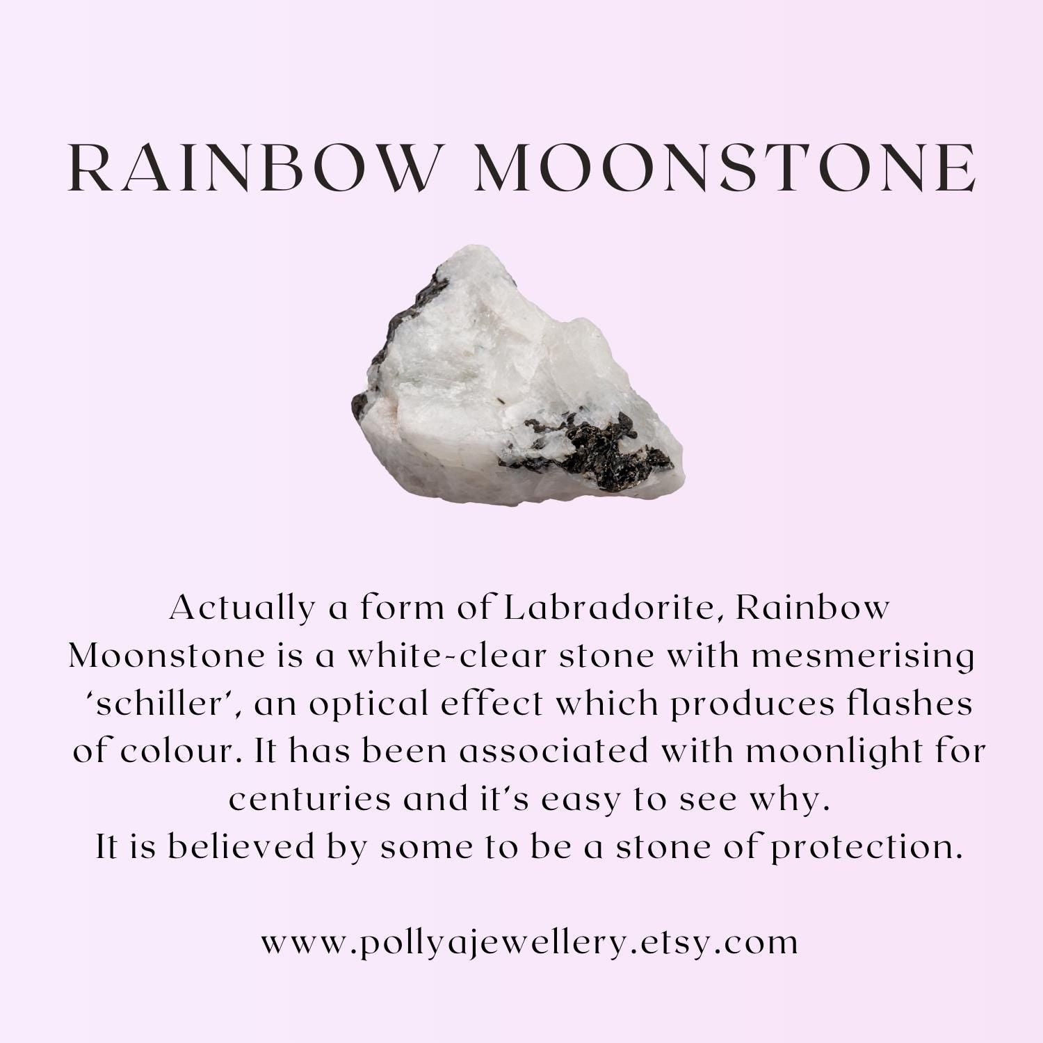 A birthstone for the month of June, Rainbow Moonstone is a magical looking stone, with internal glow and flashes of colour. In several ancient cultures it was believed to be solidified moonbeams, and has been believed to be a stone of protection. Whatever your beliefs, it is easy to see why this entrancing gemstone was named after the moon.