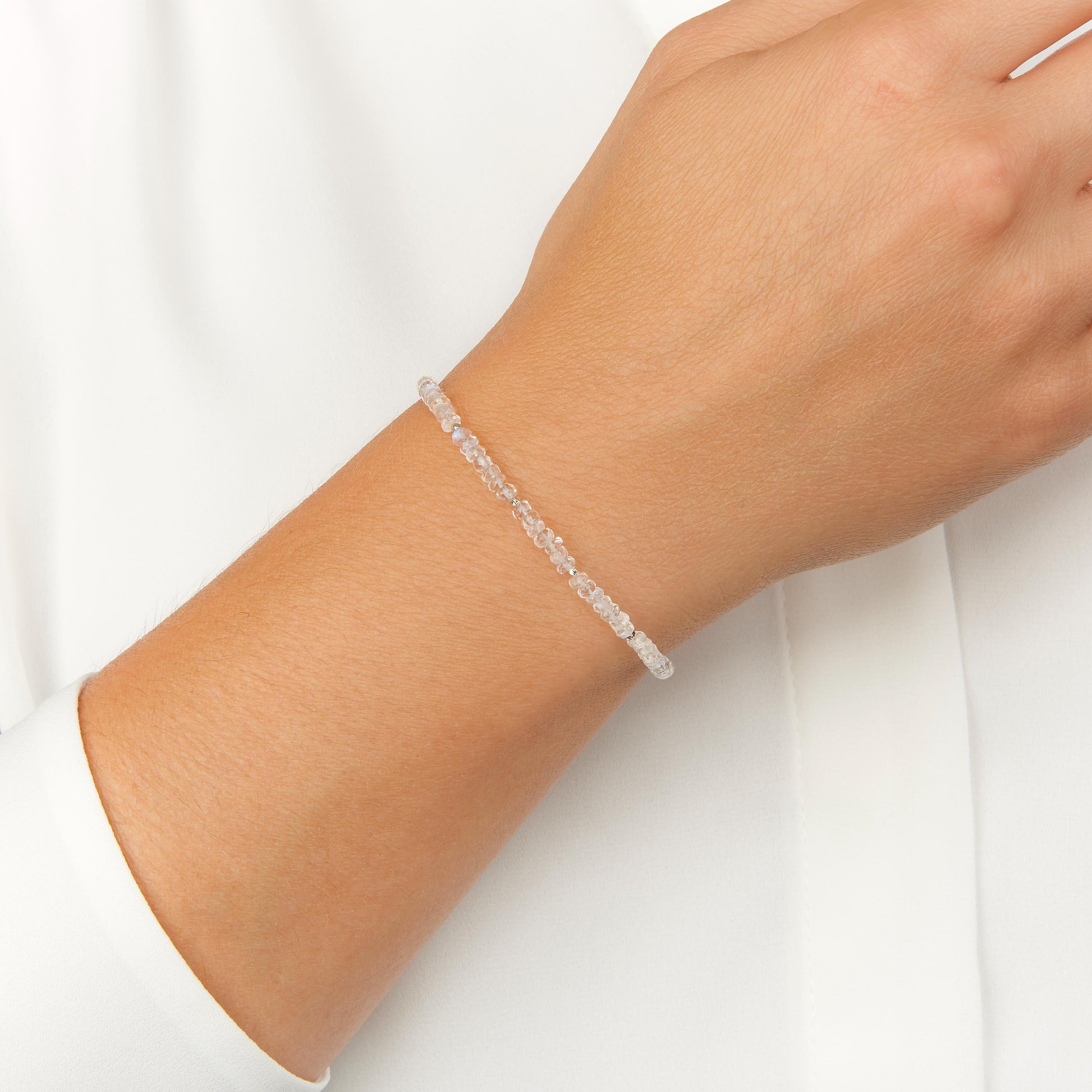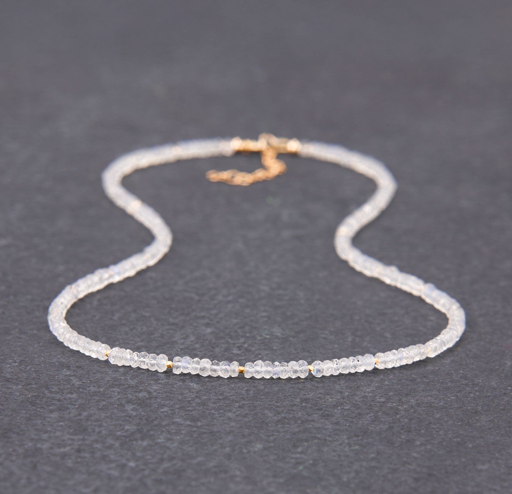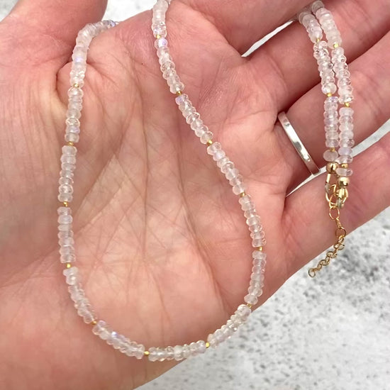 A slender and elegant necklace featuring beautiful natural little Rainbow Moonstone gemstone beads, faceted for brilliant sparkle. These gemstone are of the highest quality, graded AAA, and showing stunning flashes of blue, green and yellow hues. Tiny faceted beads in your choice of Gold Vermeil or Sterling Silver add a luxurious touch to this delicate piece.