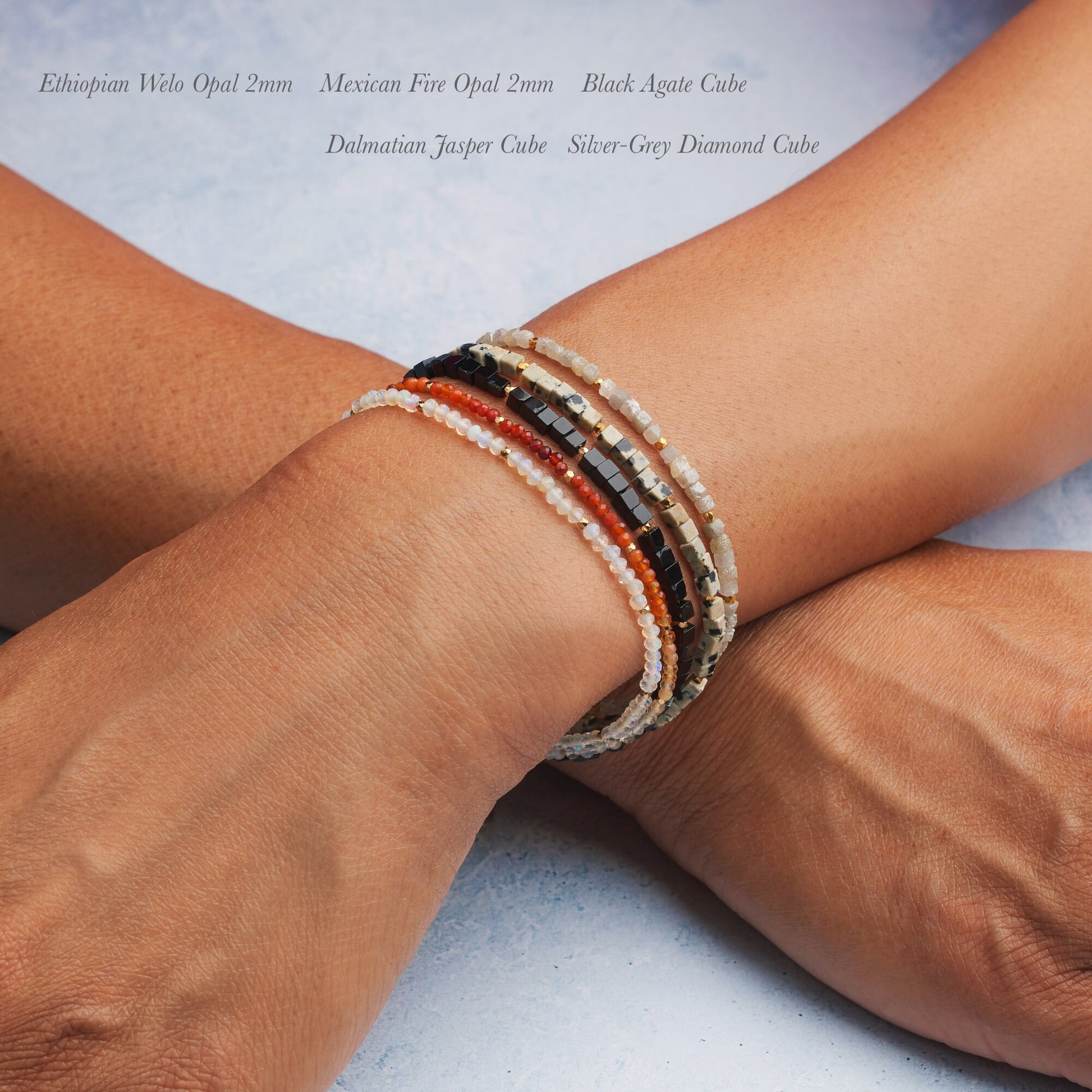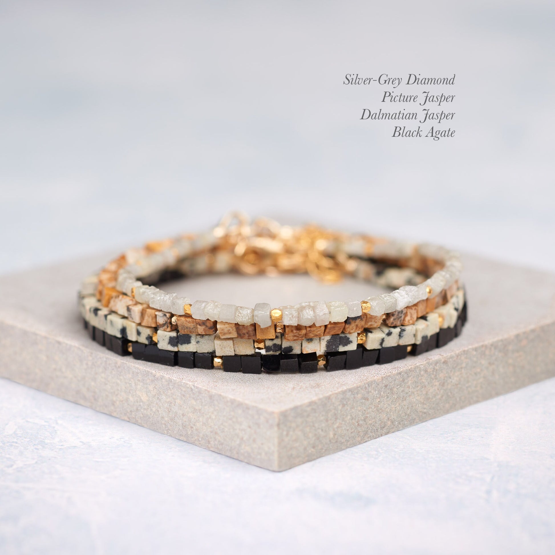 Very dainty genuine natural raw Silver-Grey Diamonds in a geometric yet rustic cube cut are interspersed with tiny faceted beads in your choice of Gold Vermeil or 925 Sterling Silver in this delicate but captivating bracelet. These silvery-grey rough diamond stones are full of bewitching sparkle and organic interest.