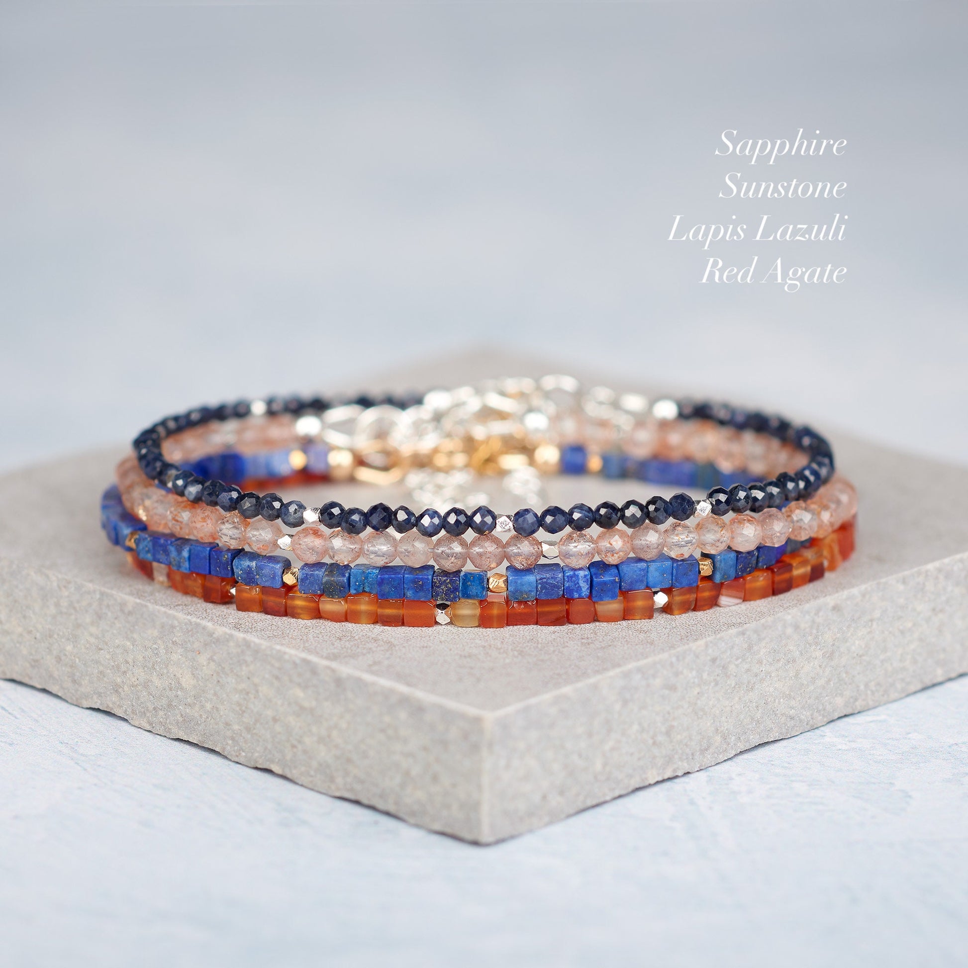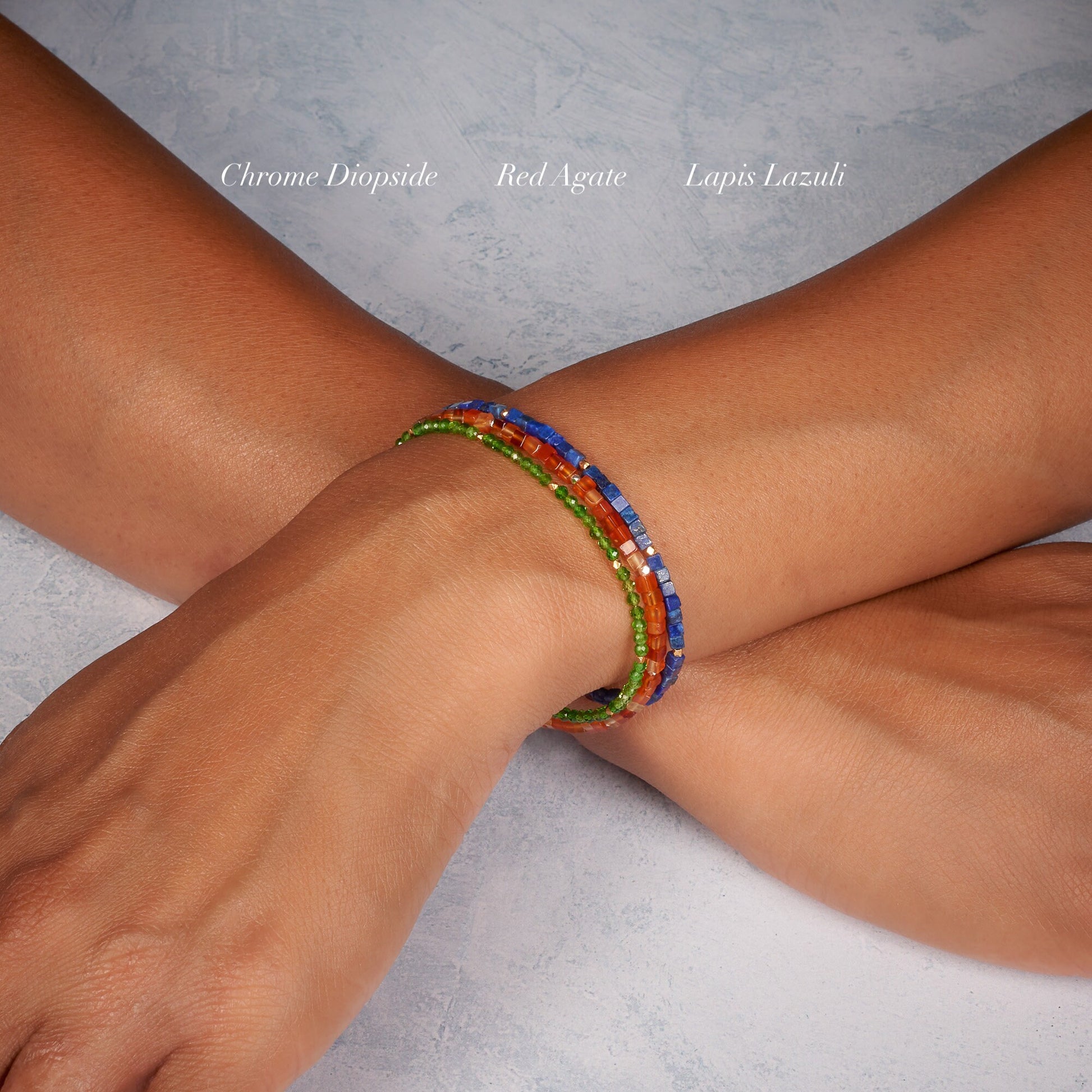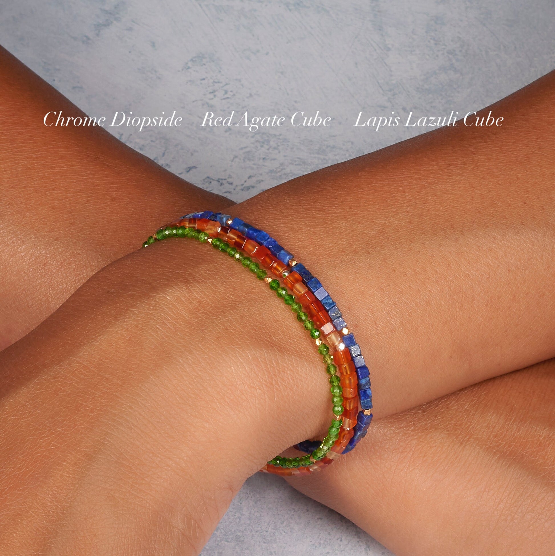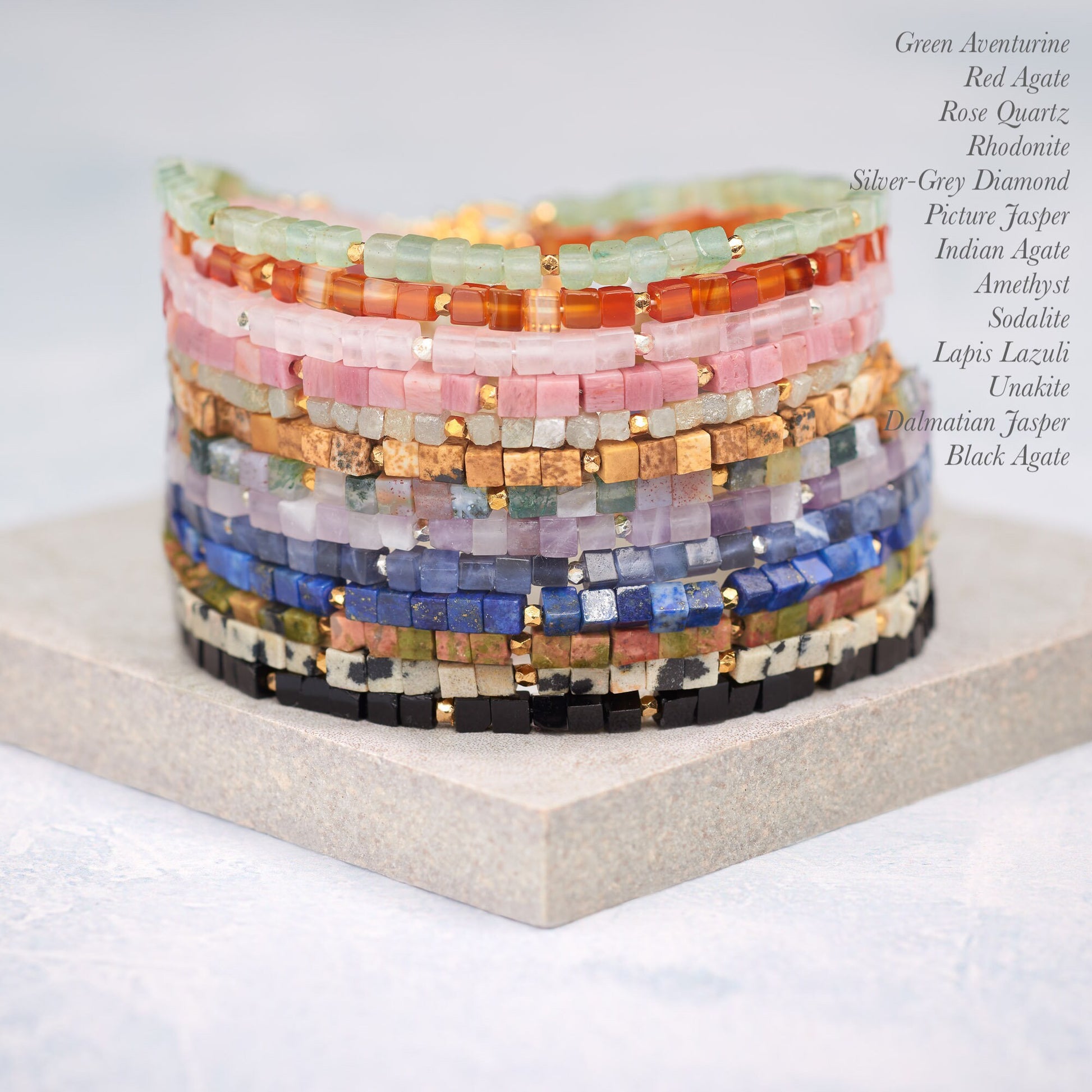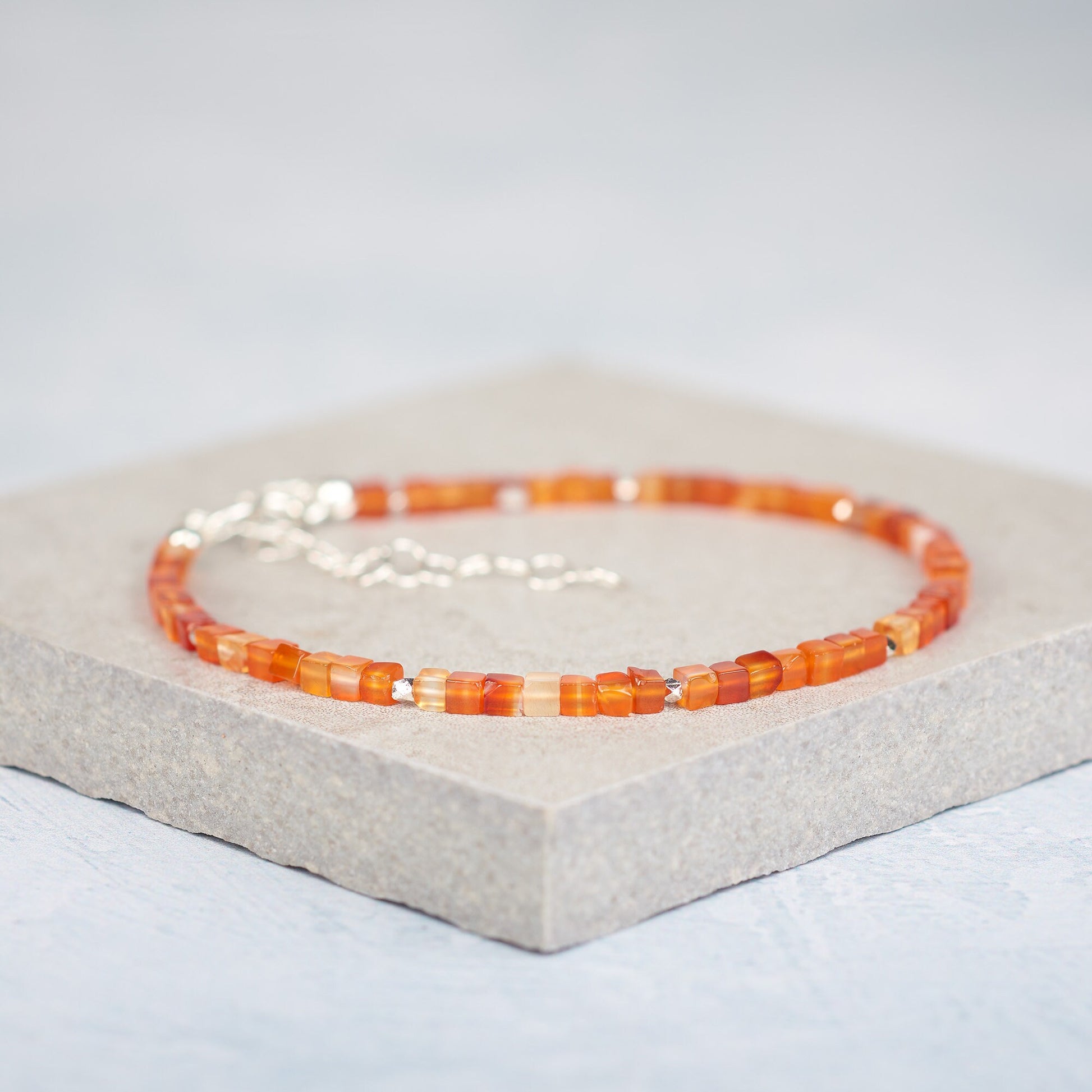 Tiny natural Red Agate gemstone cube beads create a modern, minimalist and geometric look in this dainty bracelet. The Red Agate stones have plenty of the wonderfully warming orange tones for which this gemstone is treasured and are interspersed with your choice of Sterling Silver or Gold Vermeil beads.