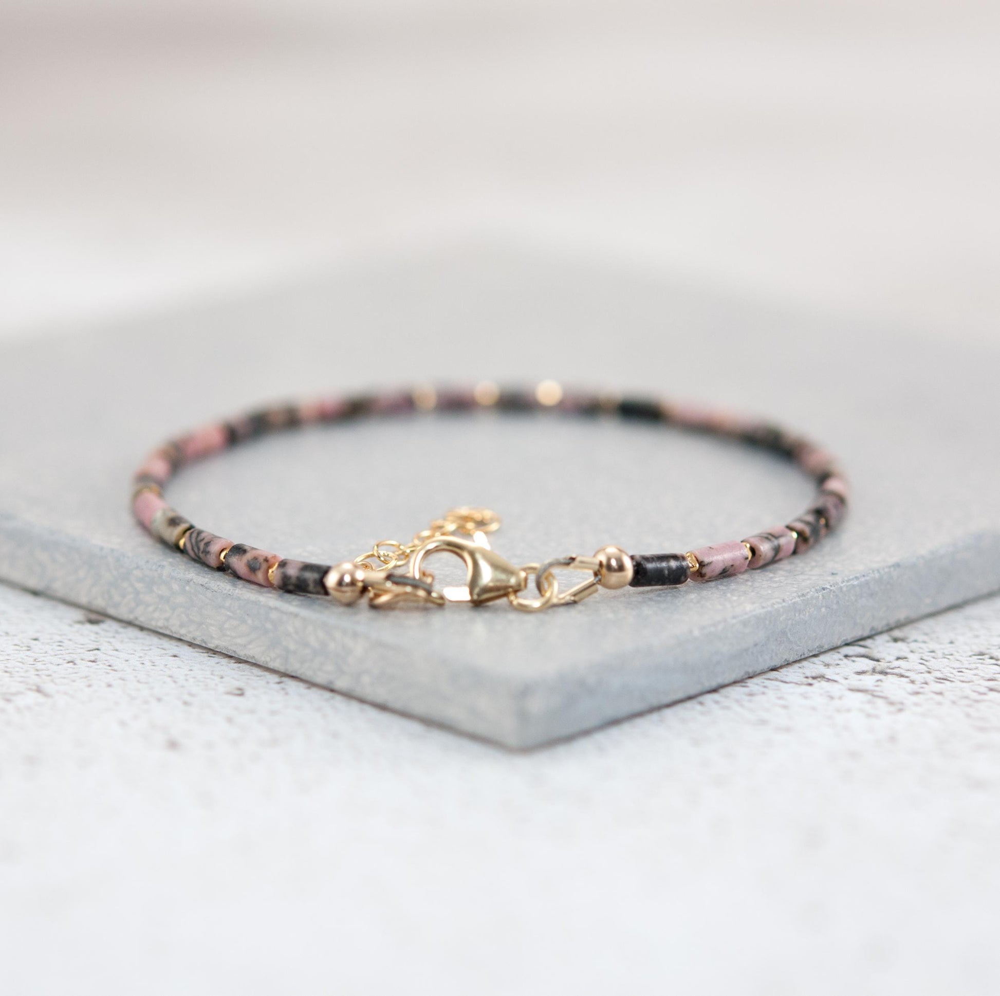 Tiny Rhodonite gemstone beads in an elegant tube shape create a sleek sophisticated look in this dainty gemstone bracelet. These natural gemstones have lovely mottled patterns of rose pink and black, with each bead being unique, and are interspersed with your choice of Gold Vermeil or Sterling Silver beads.
