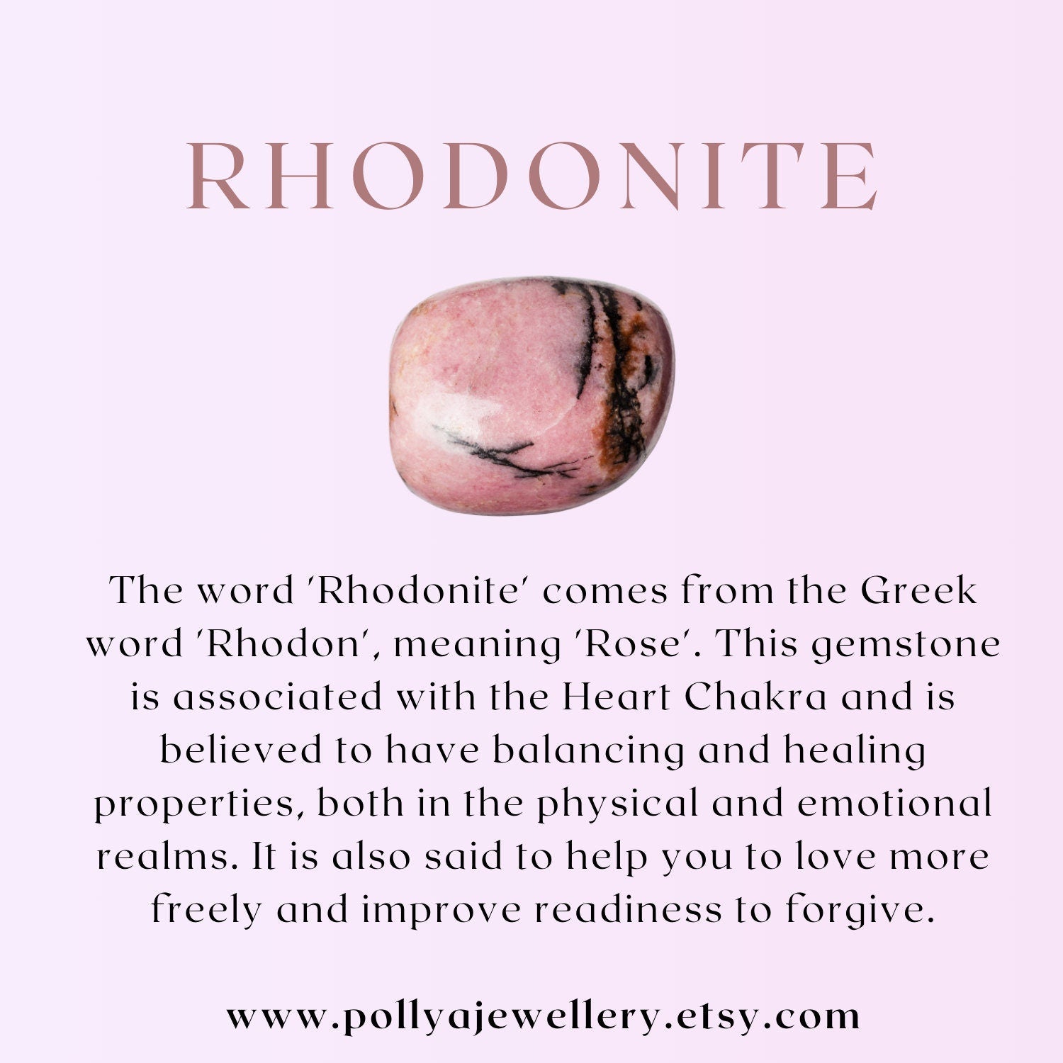 The word 'Rhodonite' comes from the Greek word 'Rhodon', meaning 'Rose'. This gemstone is associated with the Heart Chakra and is believed to have balancing and healing properties, both in the physical and emotional realms. It is also said to help you to love more freely and improve readiness to forgive.