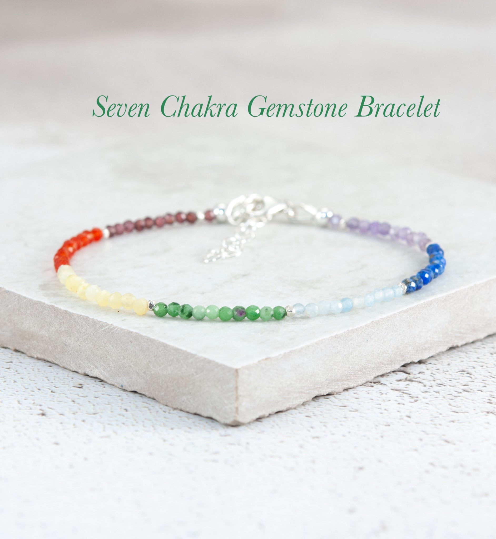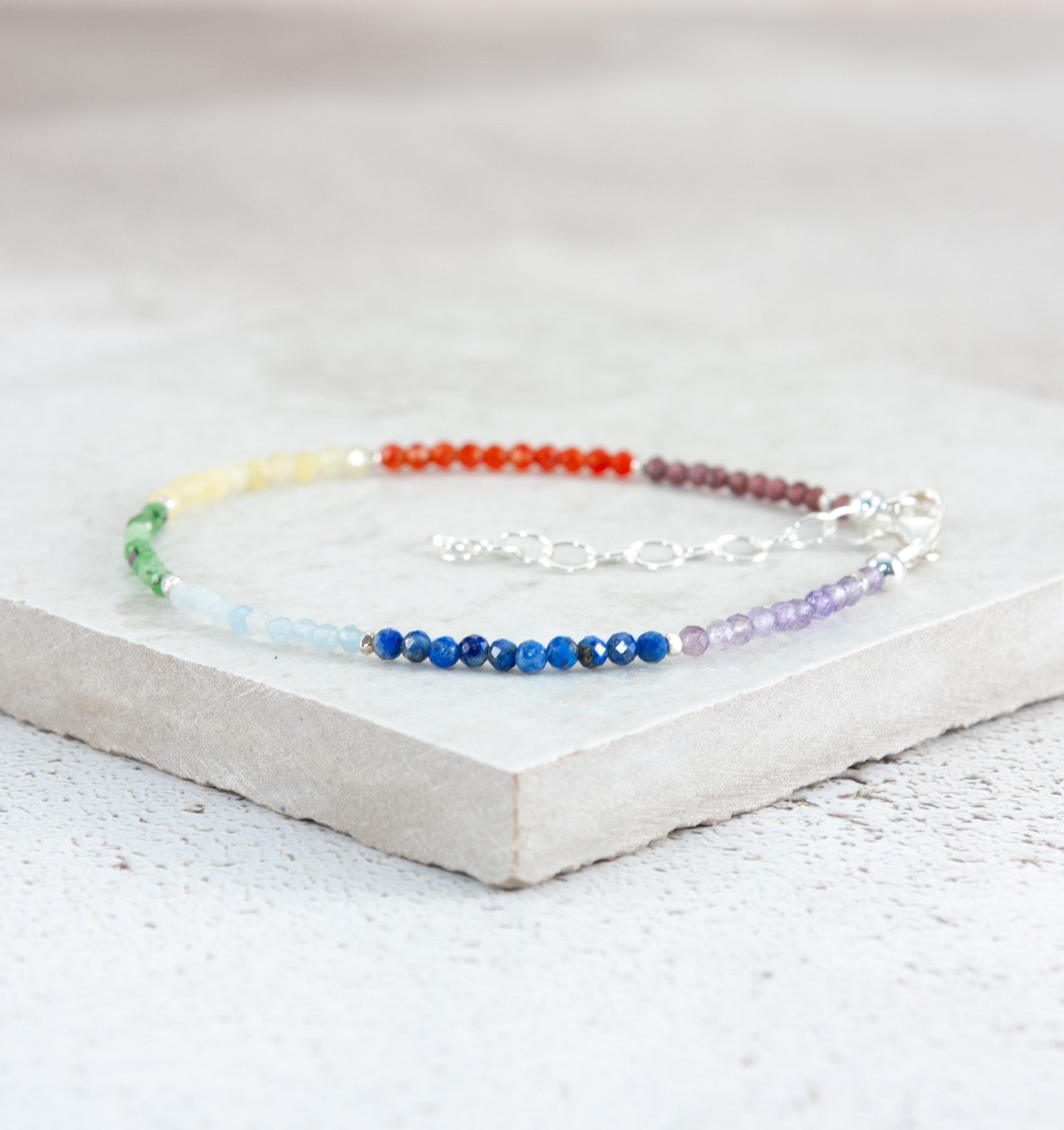 A super dainty and pretty bracelet made with seven genuine gemstones associated with the seven Chakras, creating a vibrant and uplifting rainbow of colour on your wrist.