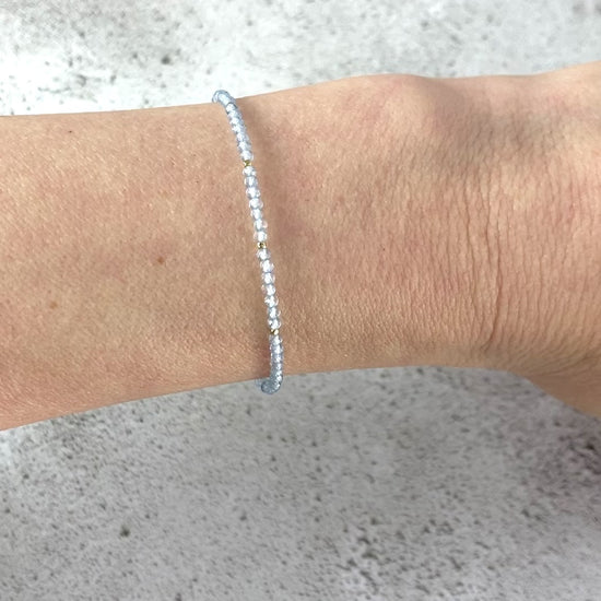 Tiny Sky Blue Topaz gemstones are micro faceted for maximum sparkle in this slender, elegant little bracelet. These beautiful genuine Topaz gemstone beads are very dainty, measuring just 2mm, have excellent clarity and a lovely pale blue colour. They are interspersed with your choice of tiny Gold Vermeil or 925 Sterling Silver beads.