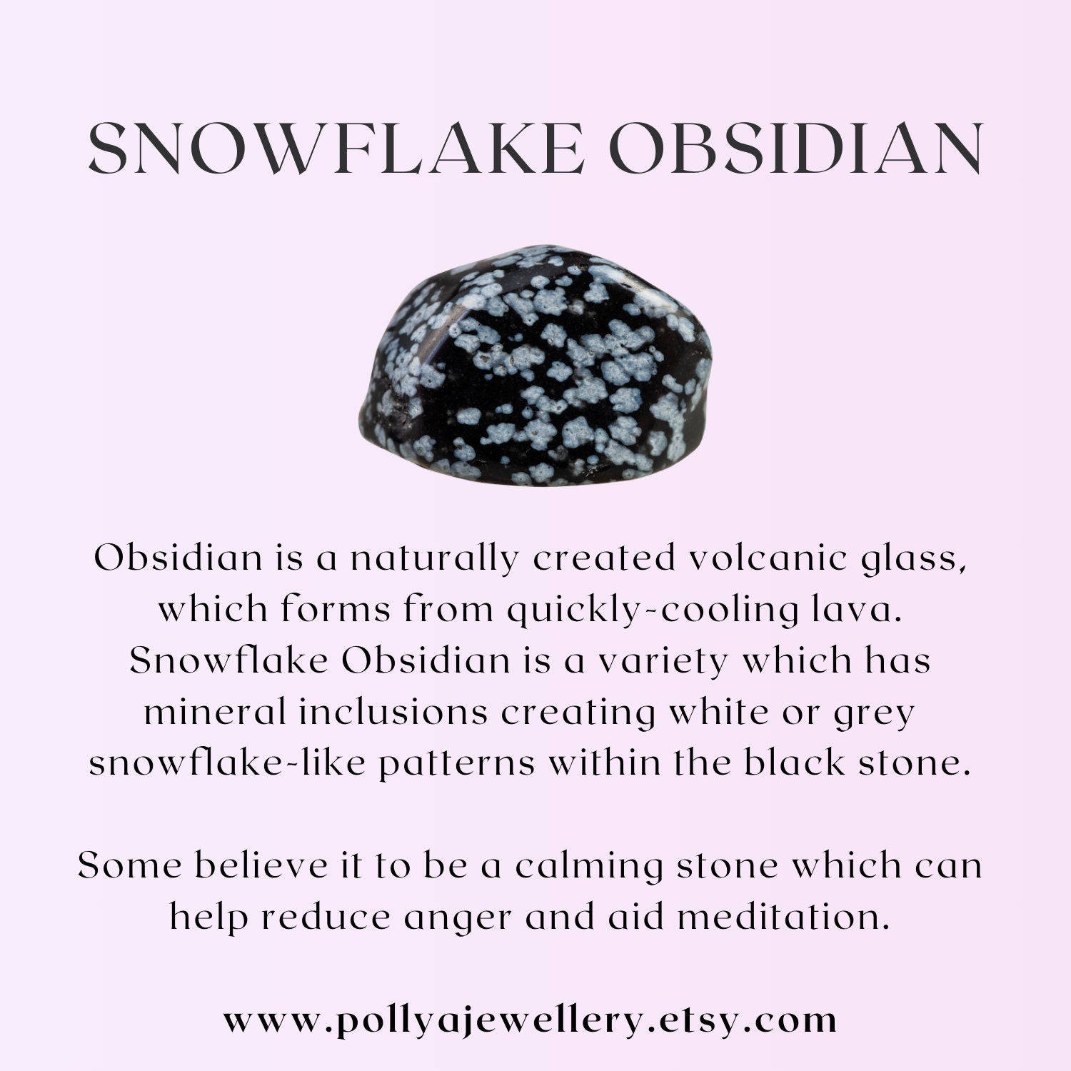 Obsidian is a naturally created volcanic glass, which forms from quickly-cooling lava. Snowflake Obsidian is a variety which has mineral inclusions creating white or grey snowflake-like patterns within the black stone. Some believe it to be a calming stone which can help reduce anger and aid meditation.