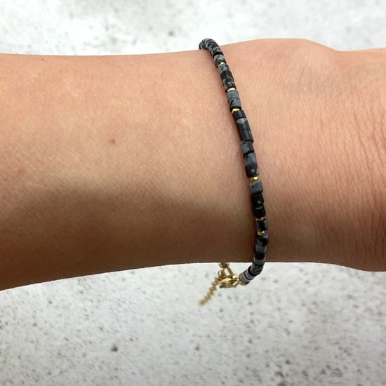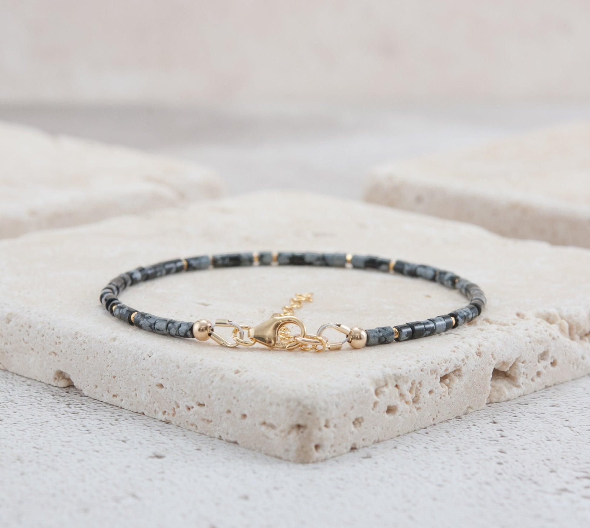 Tiny Snowflake Obsidian gemstone beads in a super dainty, slim and sweet tube cut are interspersed with your choice of Gold Vermeil or Sterling Silver beads in this very slender and elegant bracelet.
