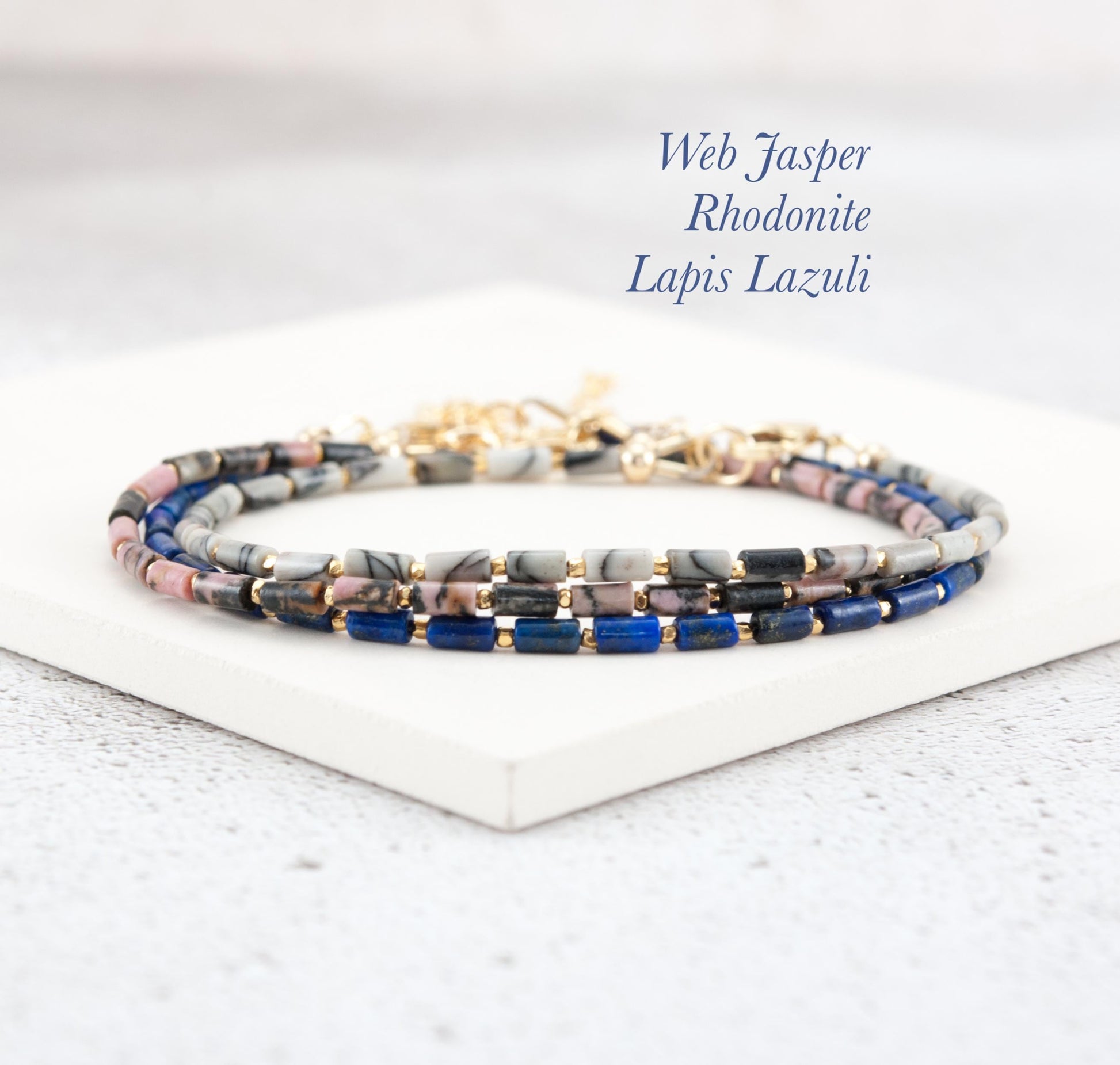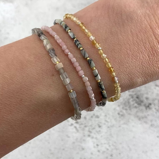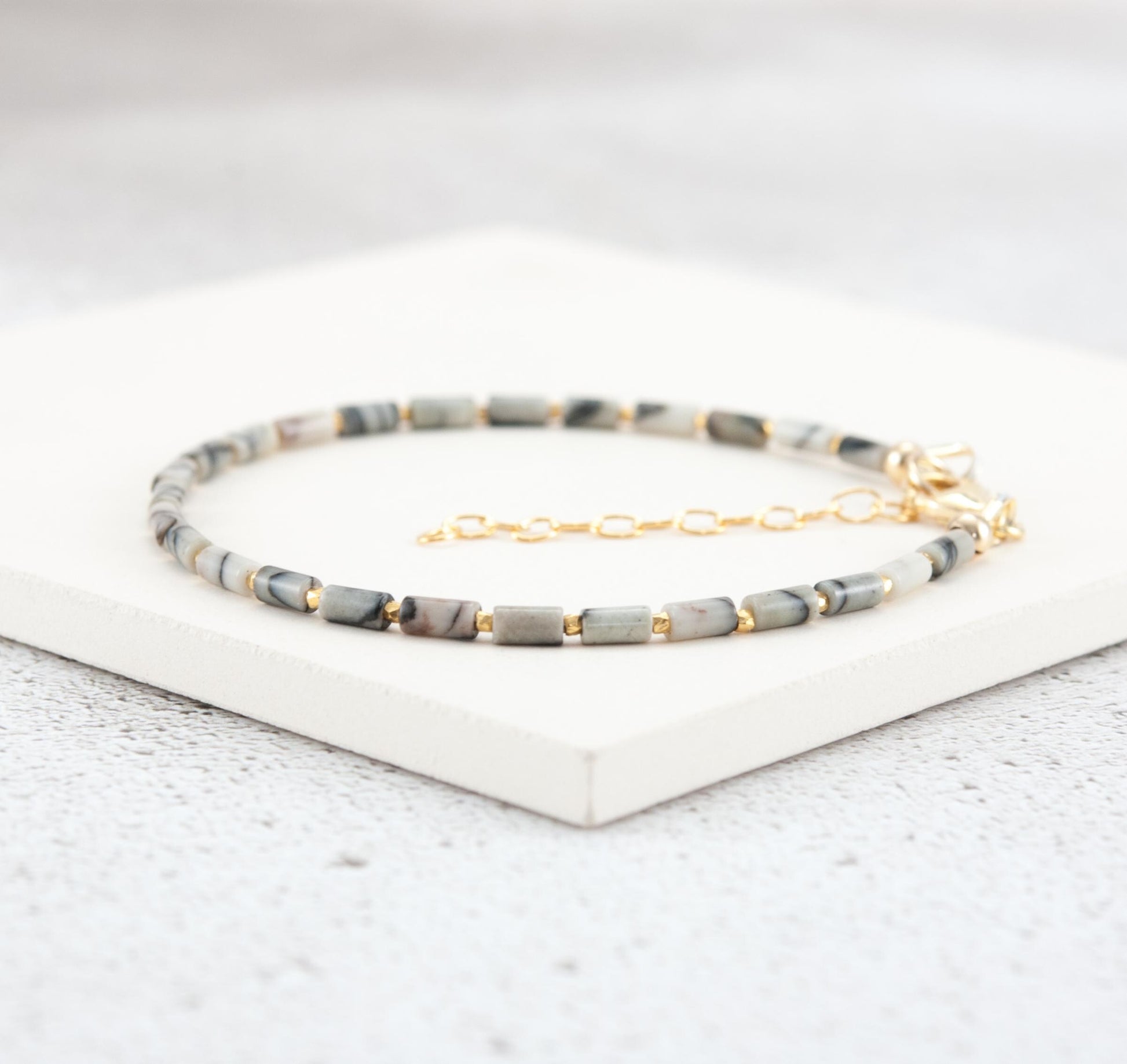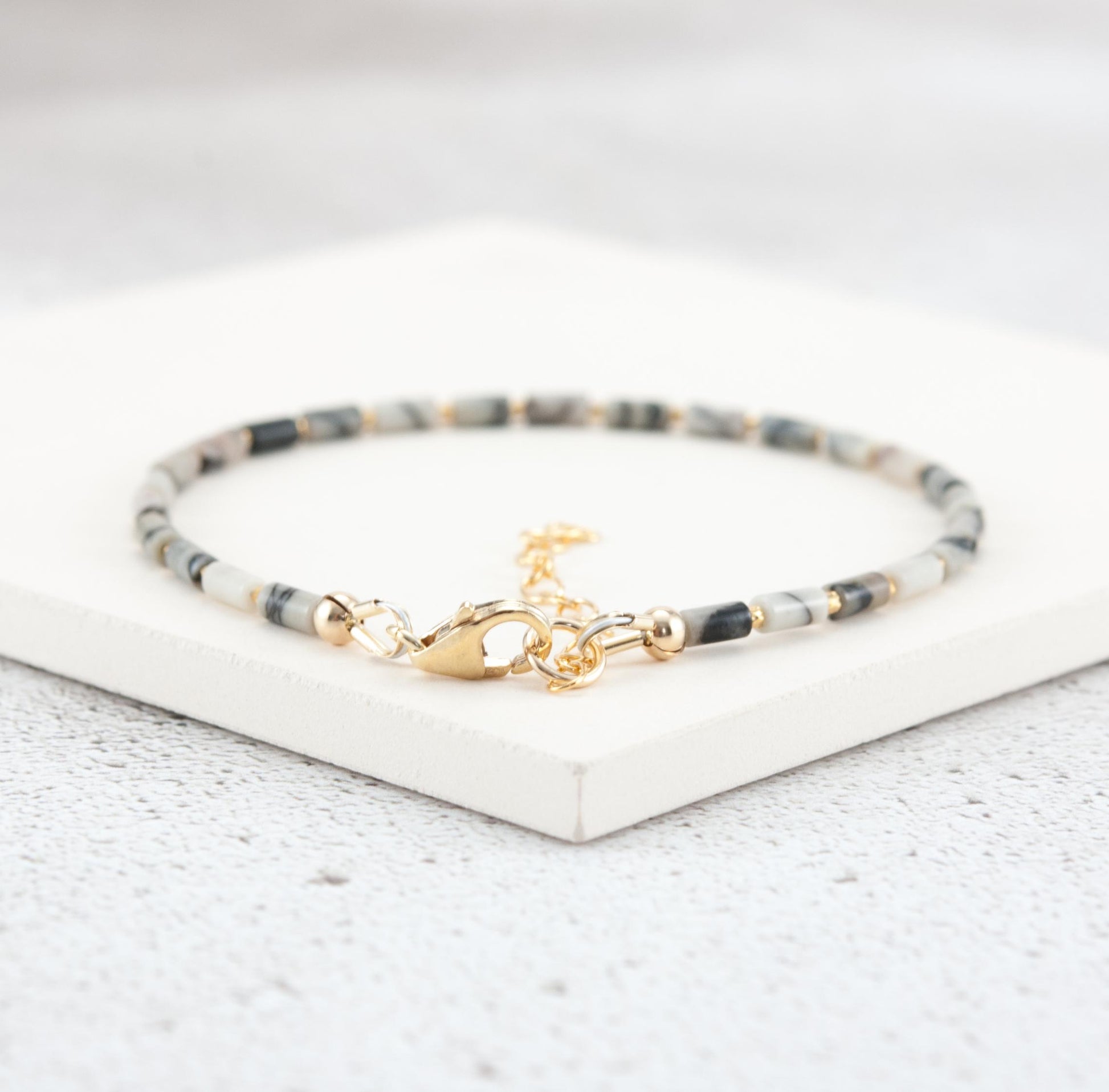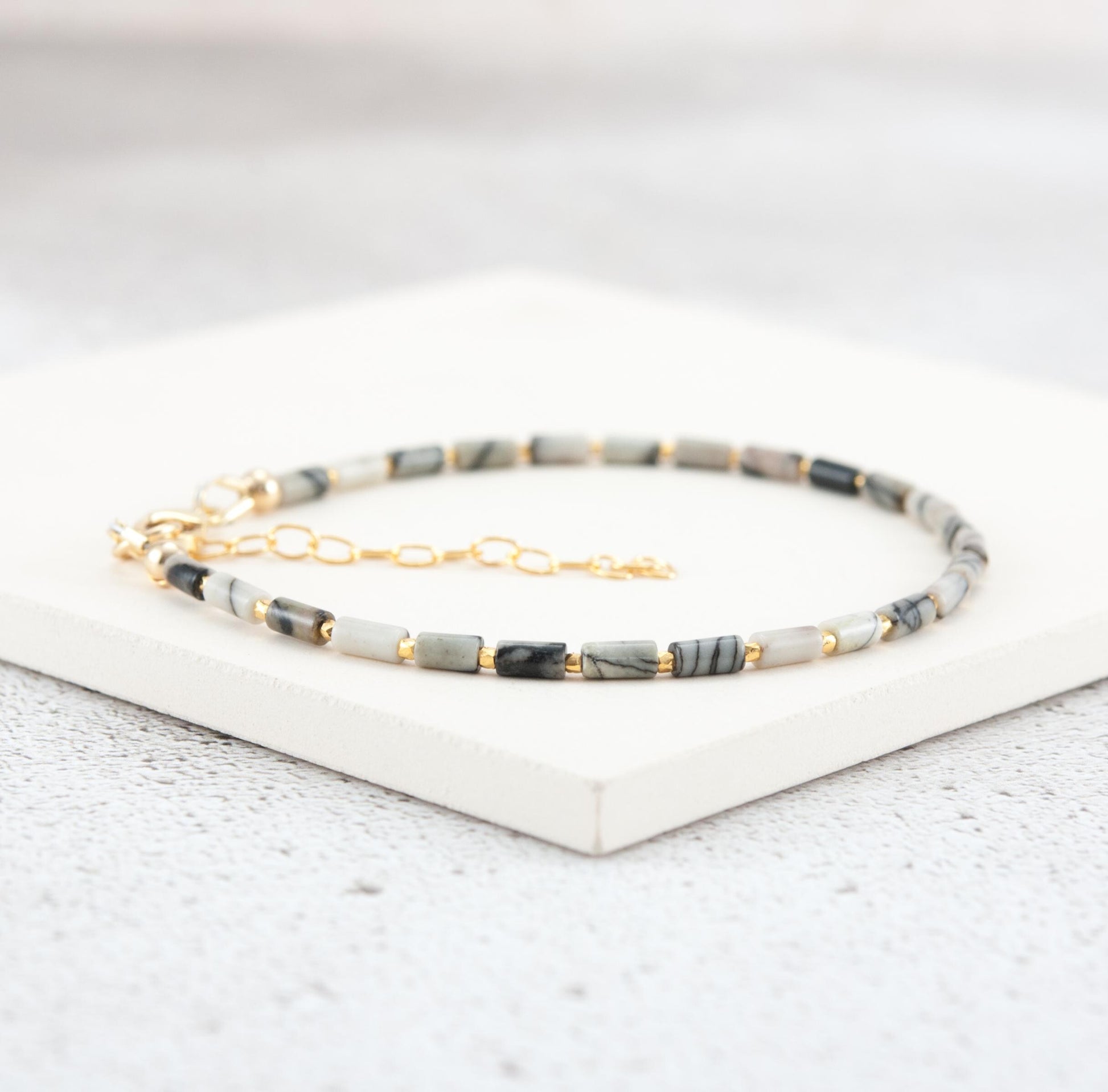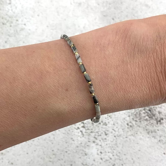 Tiny Spider Web / Netstone Jasper gemstone beads in an elegant tube shape create a sleek sophisticated look in this dainty gemstone bracelet. Although tiny, the natural stripes and lined patterns of these Jasper beads are striking. Team with your choice of Gold Vermeil beads for rich tones or 925 Sterling Silver for a cooler look.