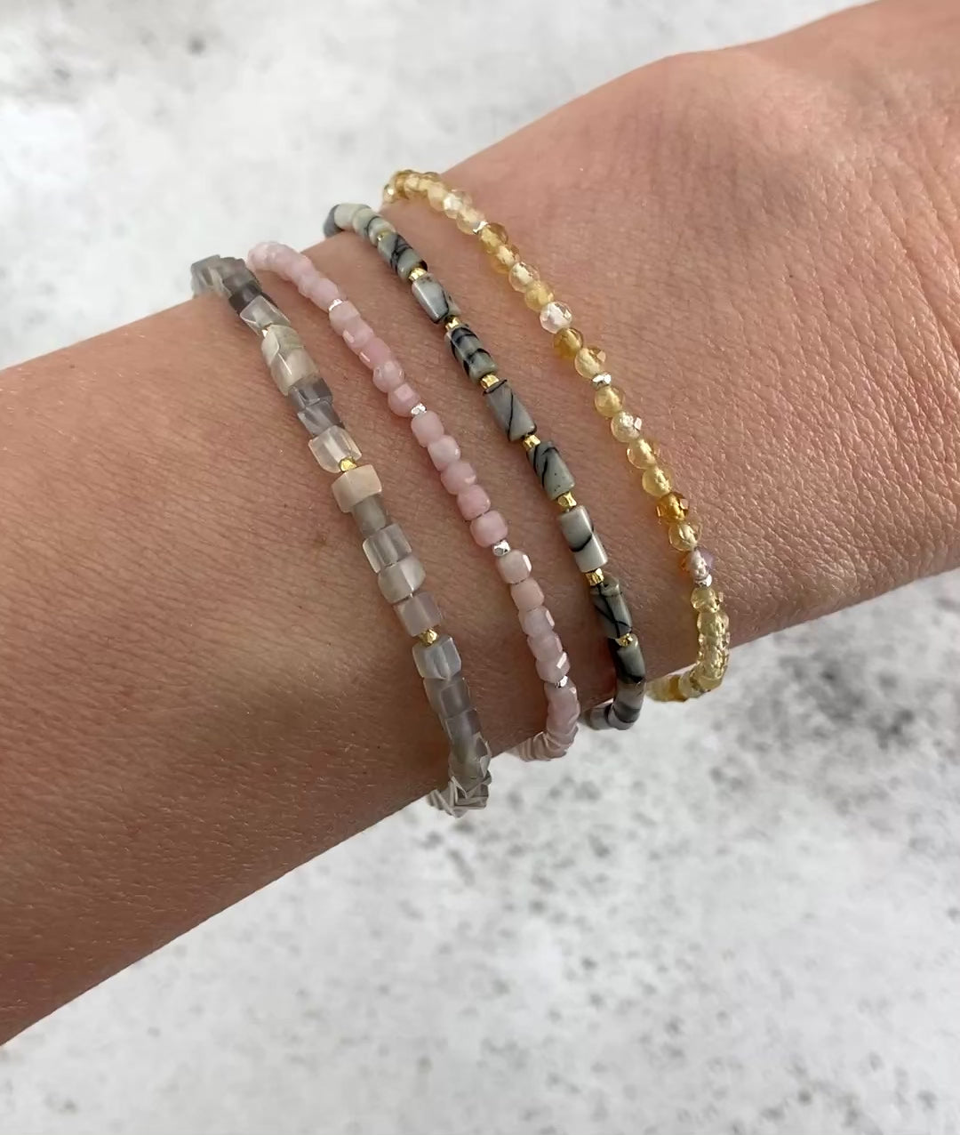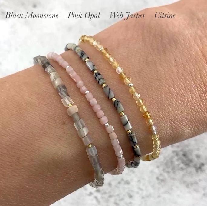 The clasp, findings and extension chain are all solid 925 Sterling Silver or 14k Gold Filled, and the beads are strung on very fine and flexible but strong jewellery wire, making the bracelet dainty in size, but strong and durable.
