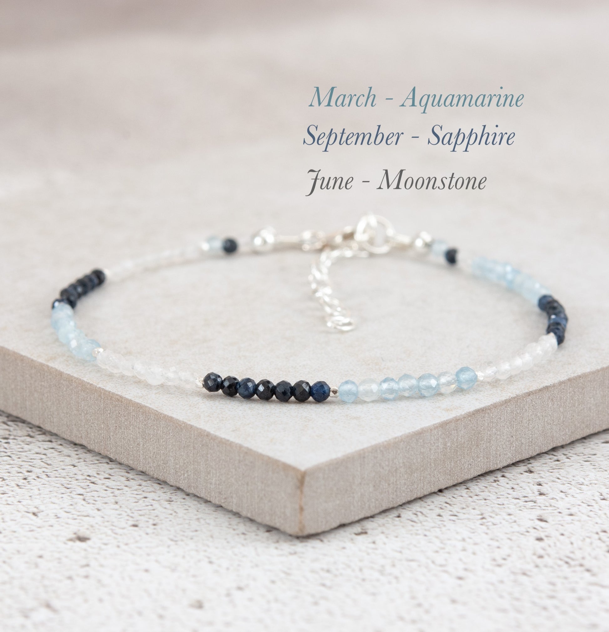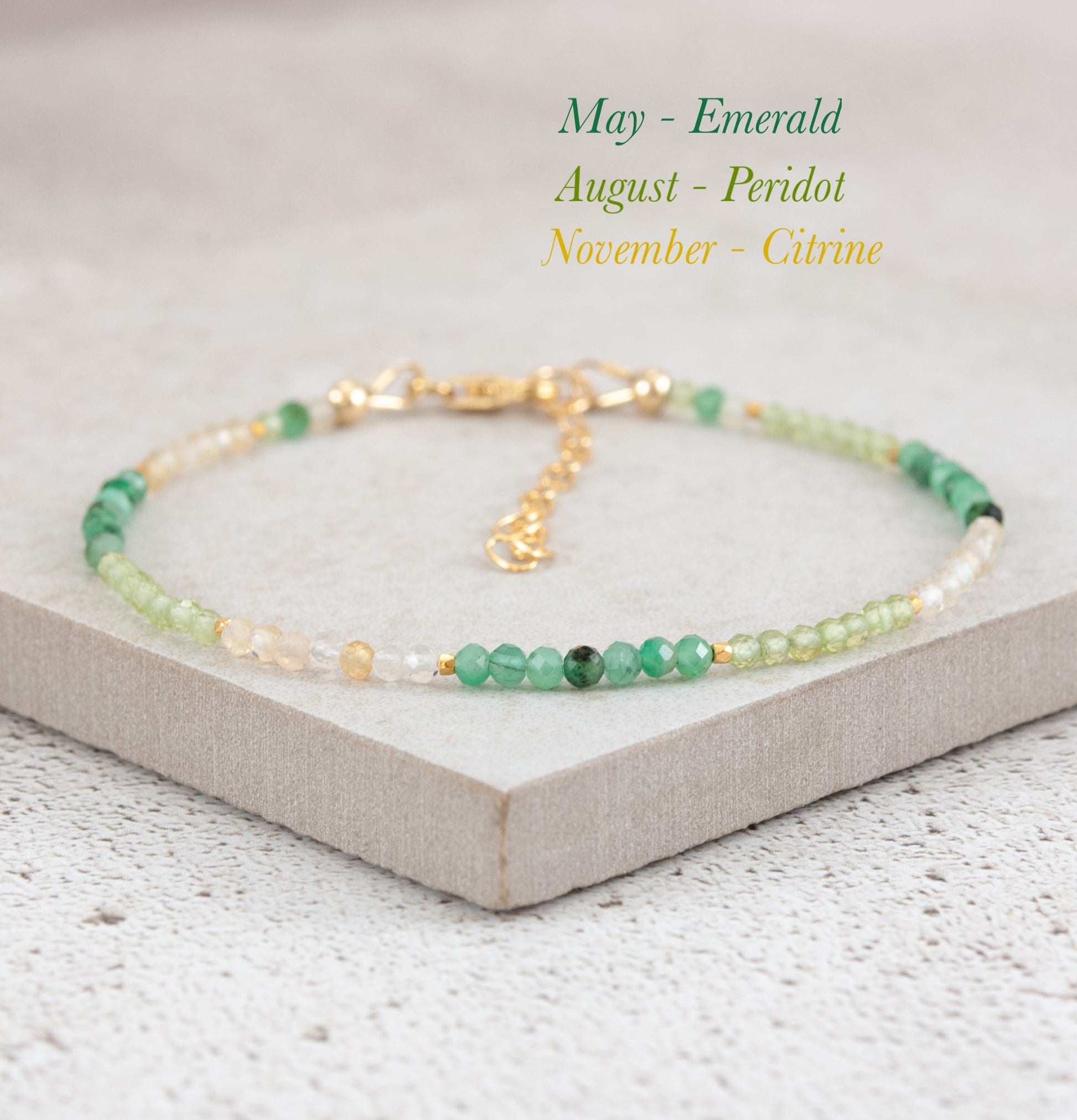 Create a meaningful and personalised piece of jewellery with this dainty three-birthstone and 14k Gold Fill bracelet. A lovely way to represent family members, friends or loved ones, and an ideal gift.