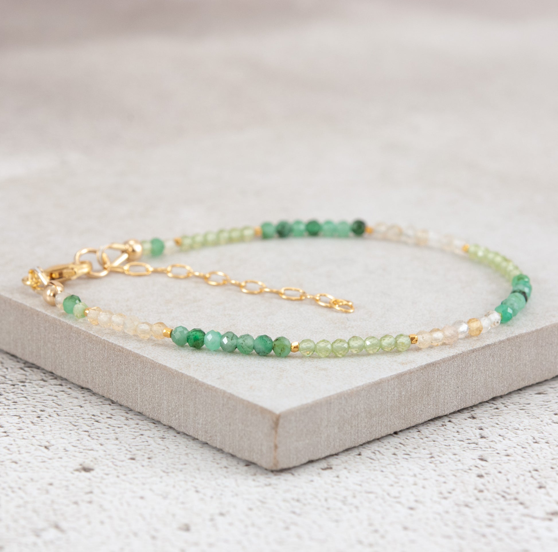 The clasps, findings and extension chains are all 14k Gold Fill, and the beads are strung on very fine and flexible but strong jewellery wire, making the bracelet dainty in size, but strong and durable.