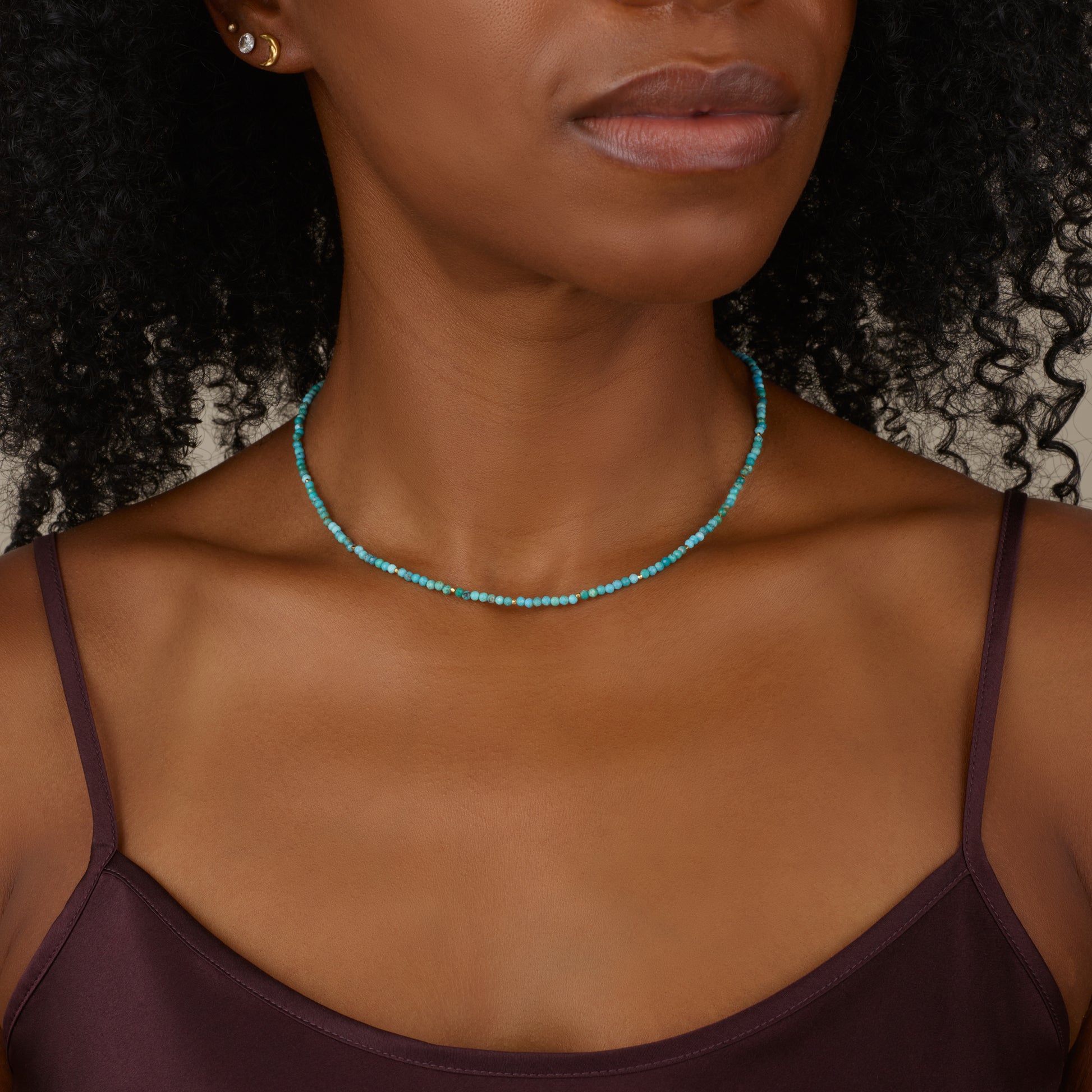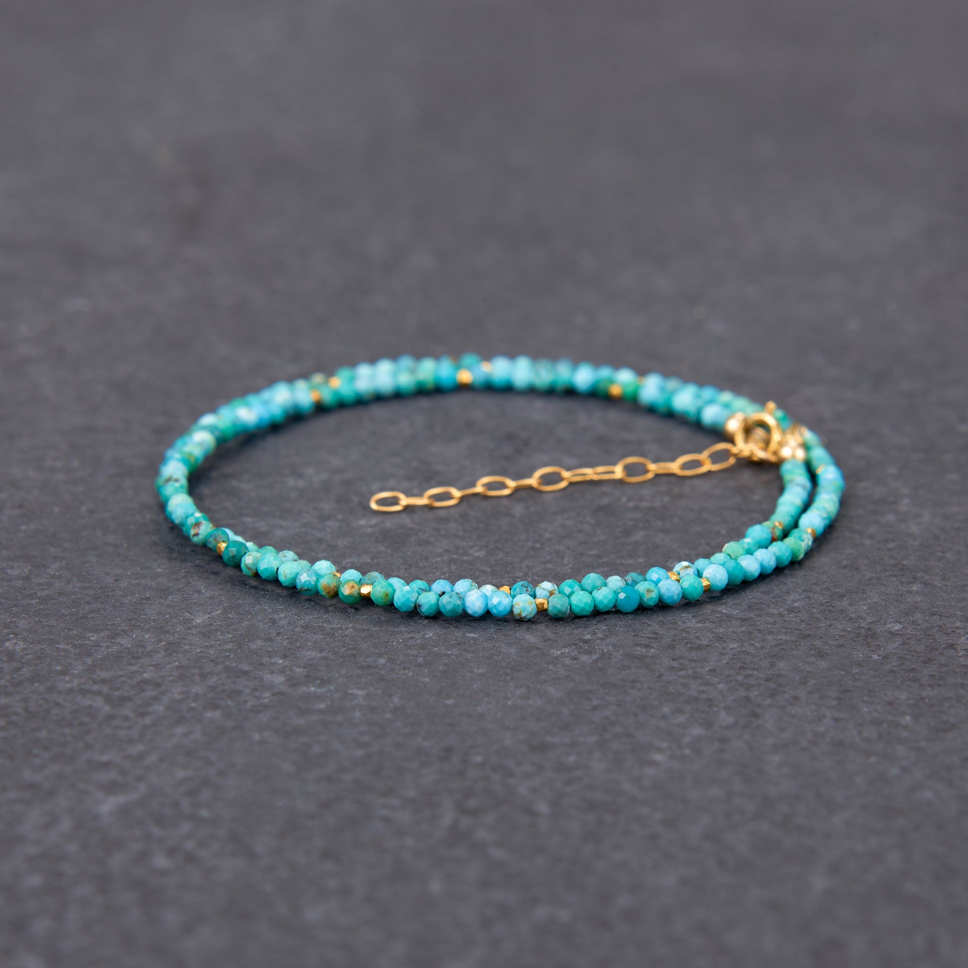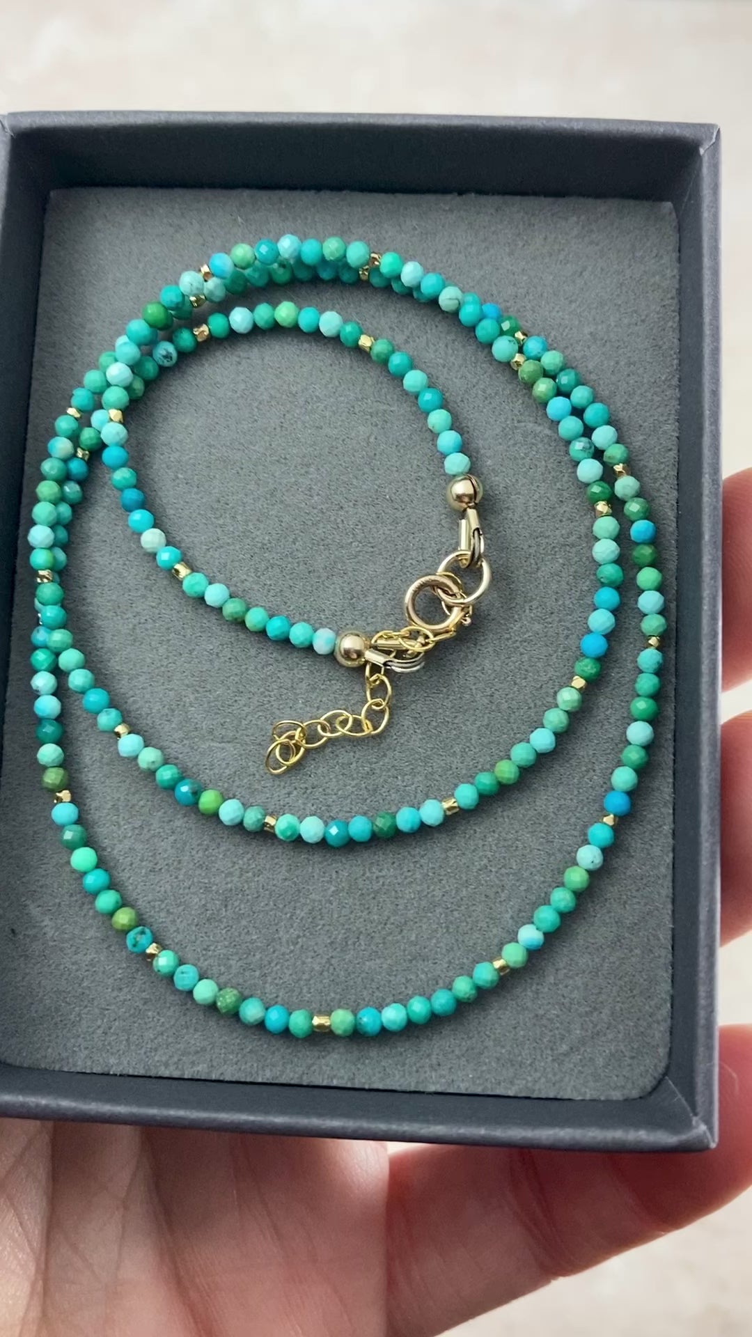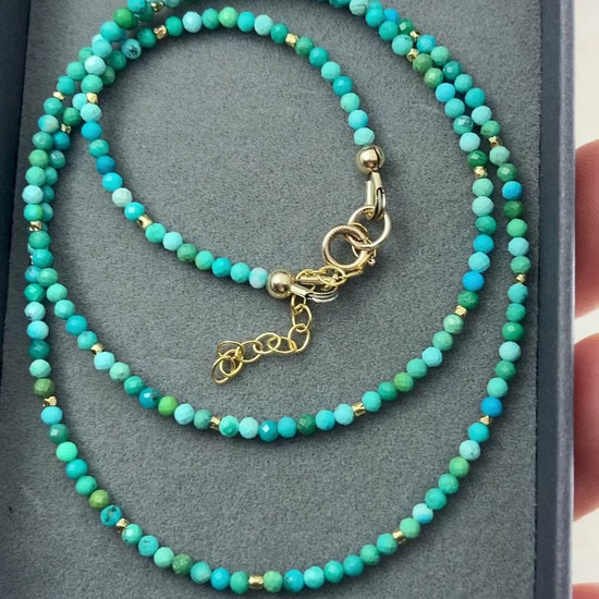 Tiny greeny-blue natural Turquoise gemstones are micro faceted for excellent sparkle in this slender, elegant necklace. These beautiful natural genuine Turquoise beads are very dainty, and are interspersed with your choice of tiny Gold Vermeil or 925 Sterling Silver beads.