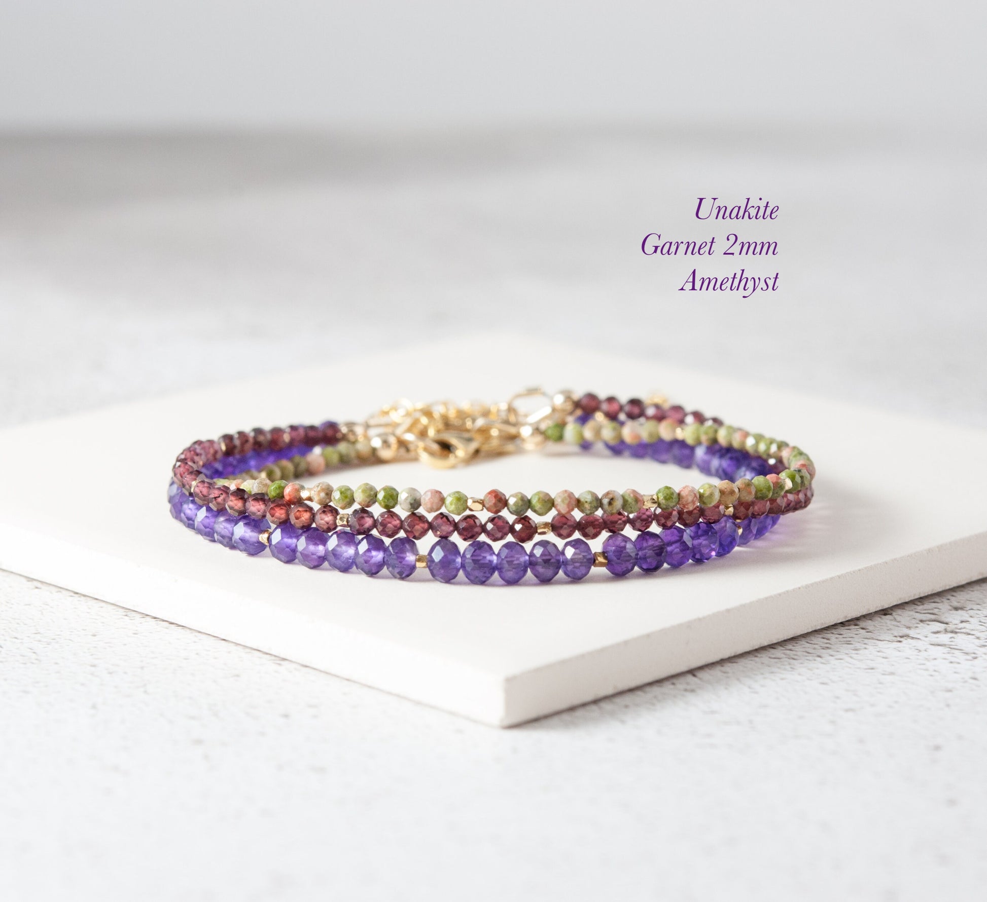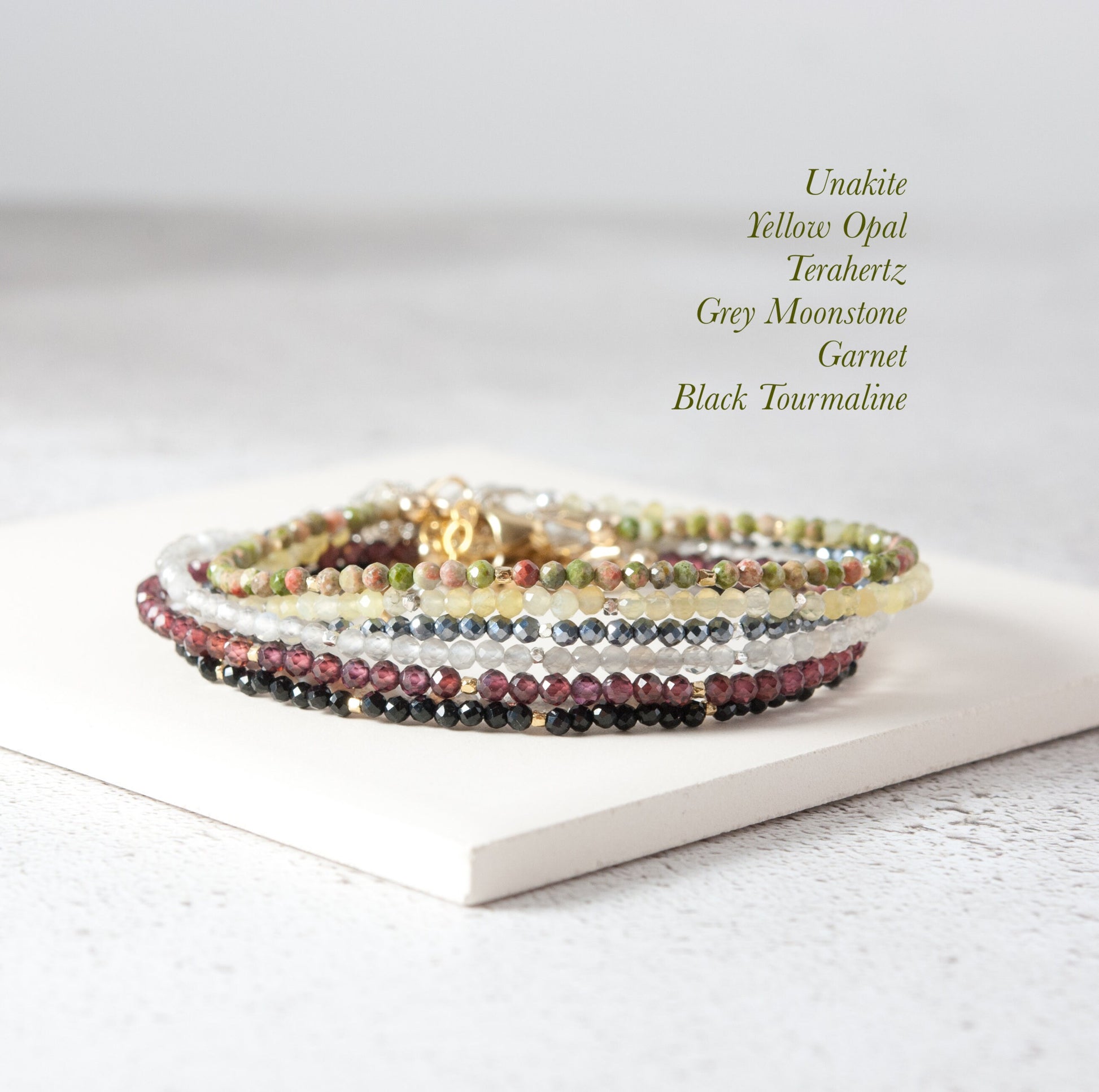 The clasp, findings and extension chain are all solid 925 Sterling Silver or 14k Gold Filled, and the beads are strung on very fine and flexible but strong jewellery wire, making the bracelet dainty in size, but strong and durable.