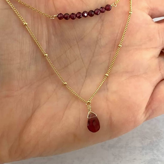 Layer 1 of this this two - layered necklace has a line of faceted tiny Garnet beads on fine cable chain. Layer 2 has a garnet teardrop pendant suspended from delicate beaded satellite chain.