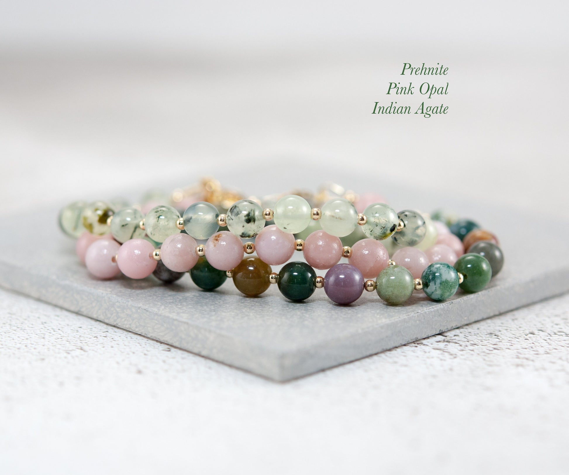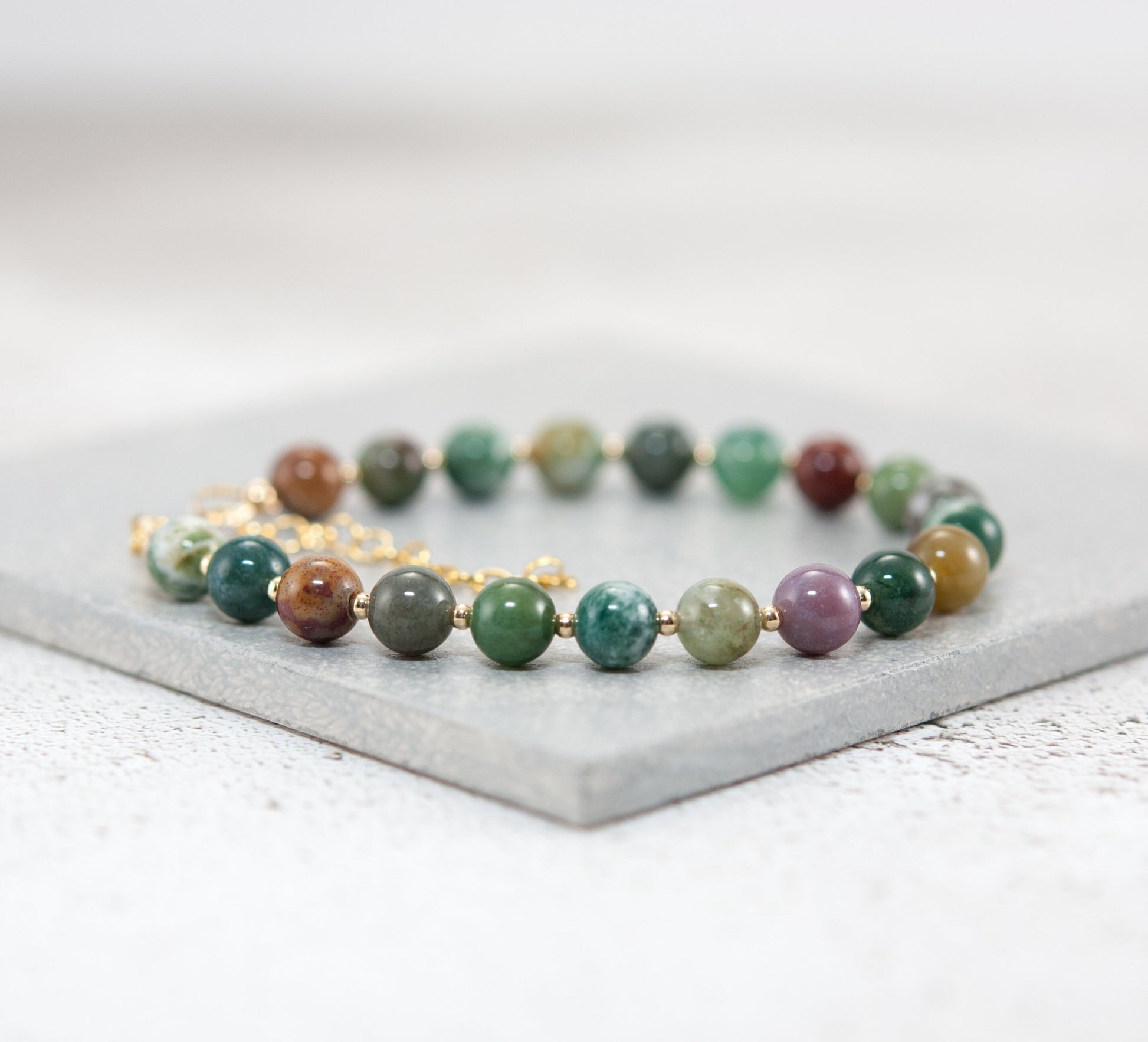 A very simple and elegant bracelet featuring natural Indian Agate gemstone beads interspersed with your choice of either Sterling Silver or Gold Filled beads. The stones show a lovely earthy range of tones including greens, browns and yellows.