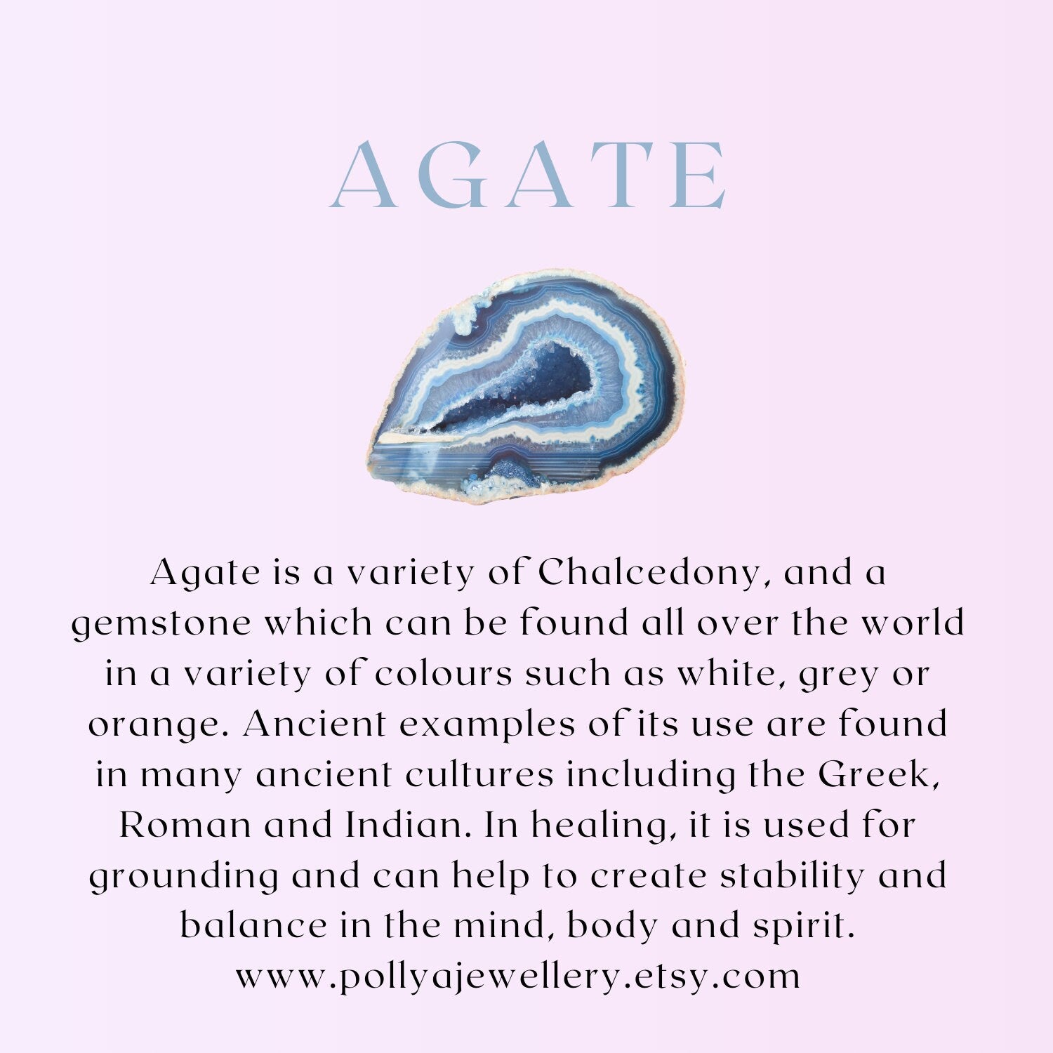Agate is a variety of Chalcedony, and a gemstone which can be found all over the world in a variety of colours such as white, grey or orange. Examples of its use are found in many ancient cultures including the Greek, Roman and Indian. In healing, it is used for grounding and can help to create stability and balance in the mind, body and spirit.