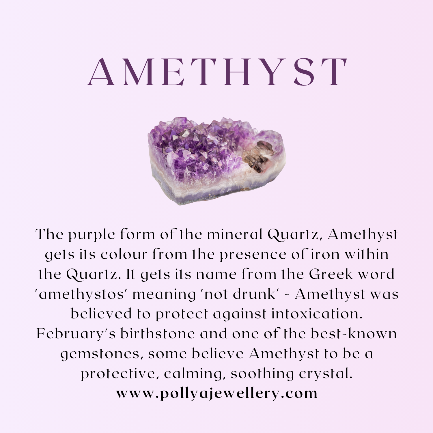 The purple form of the mineral Quartz, Amethyst gets its colour from the presence of iron within the Quartz. It gets its name from the Greek word 'amethystos' meaning 'not drunk' - Amethyst was believed to protect against intoxication. February's birthstone and one of the best-known gemstones, some believe Amethyst to be a protective, calming, soothing crystal.