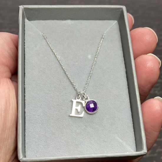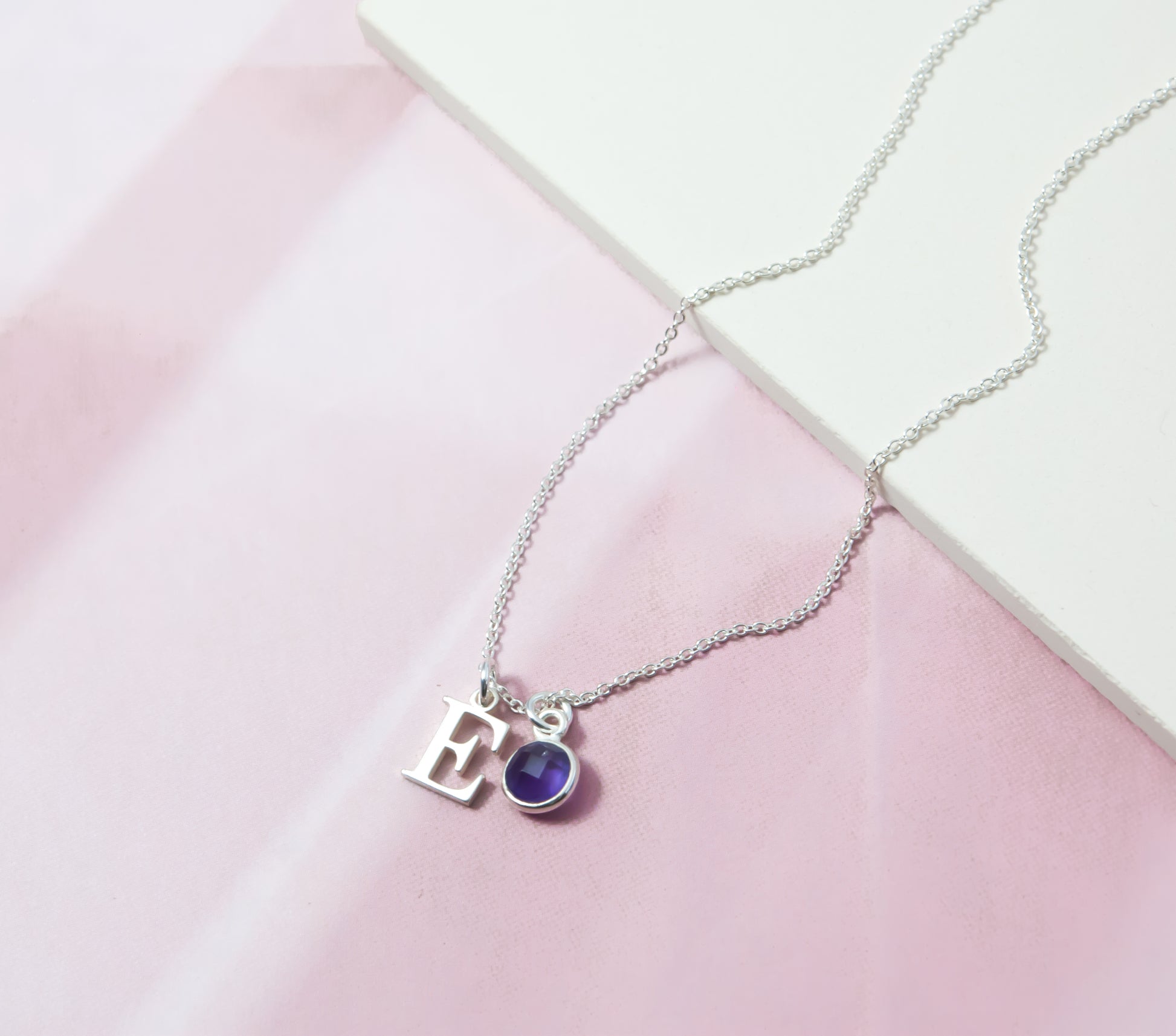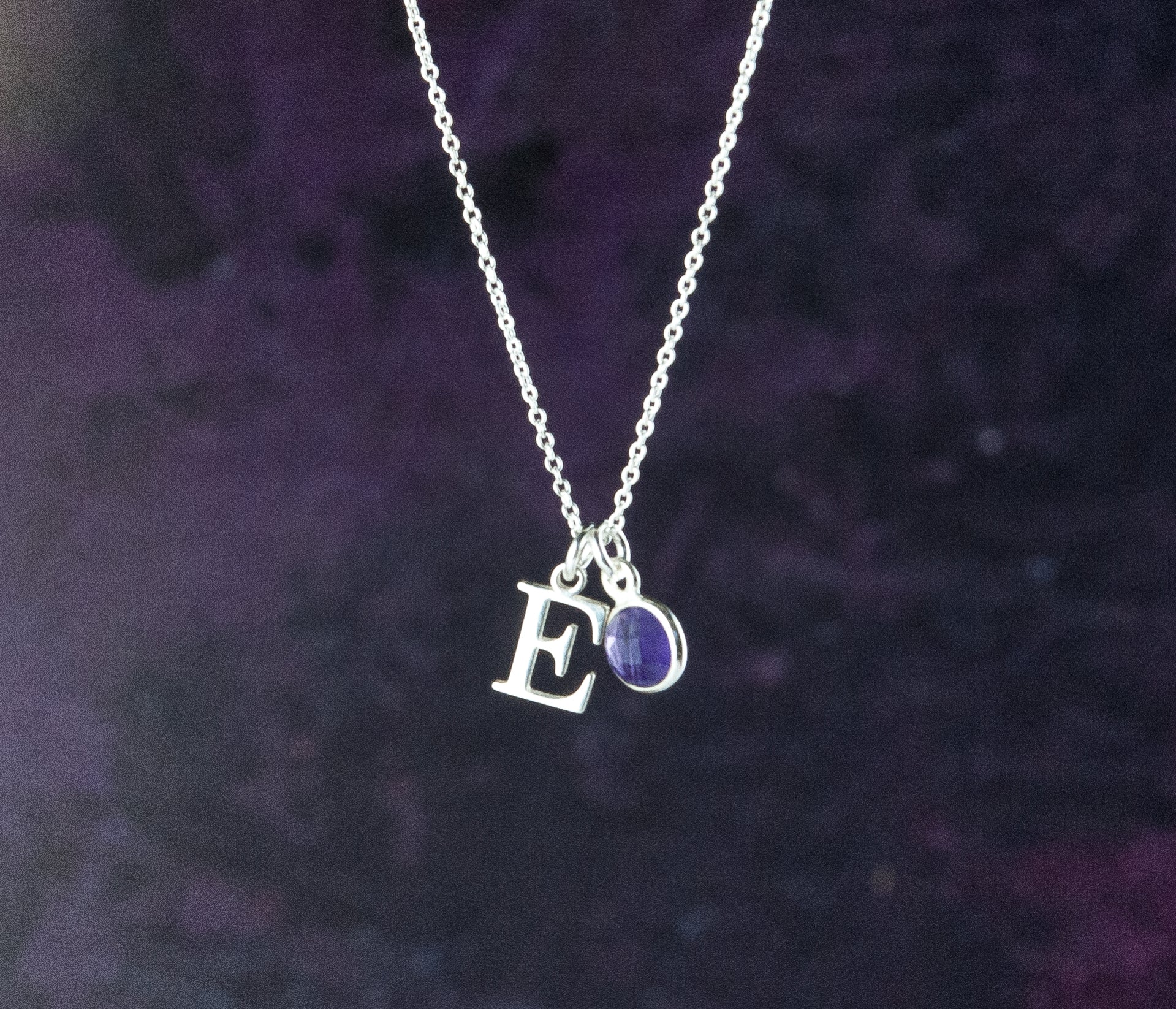 A highly personalised necklace with a genuine purple Amethyst gemstone birthstone and Sterling Silver letter threaded onto delicate, fine Sterling Silver chain. Amethyst is the traditional birthstone for February.